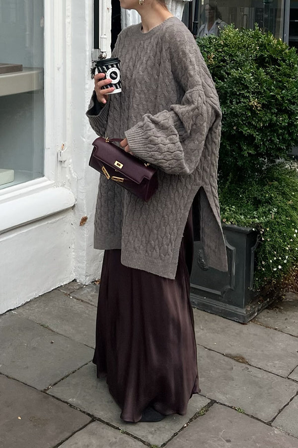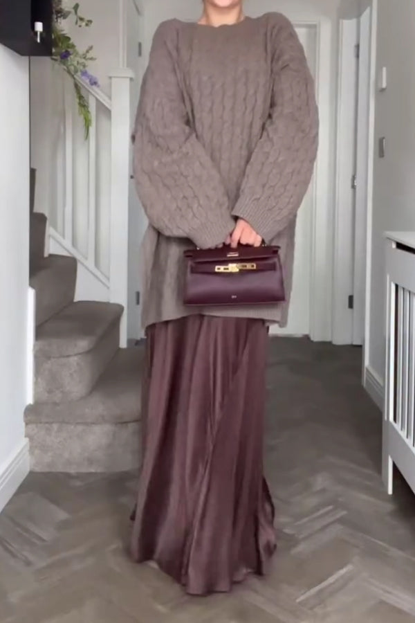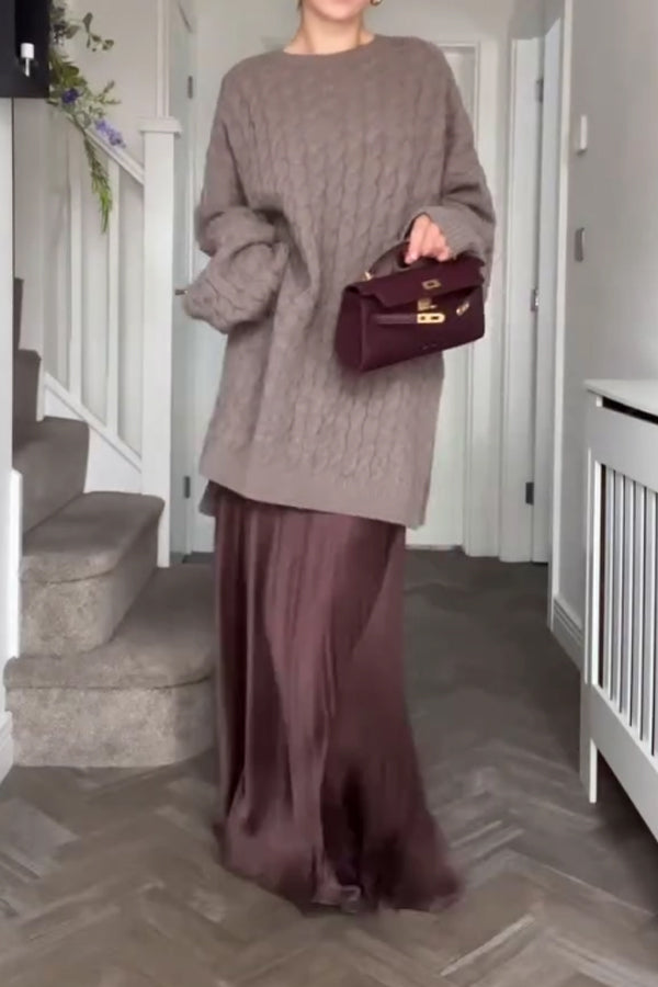 Women Classic Cable Loose Sweater + Pleated Skirt Suit