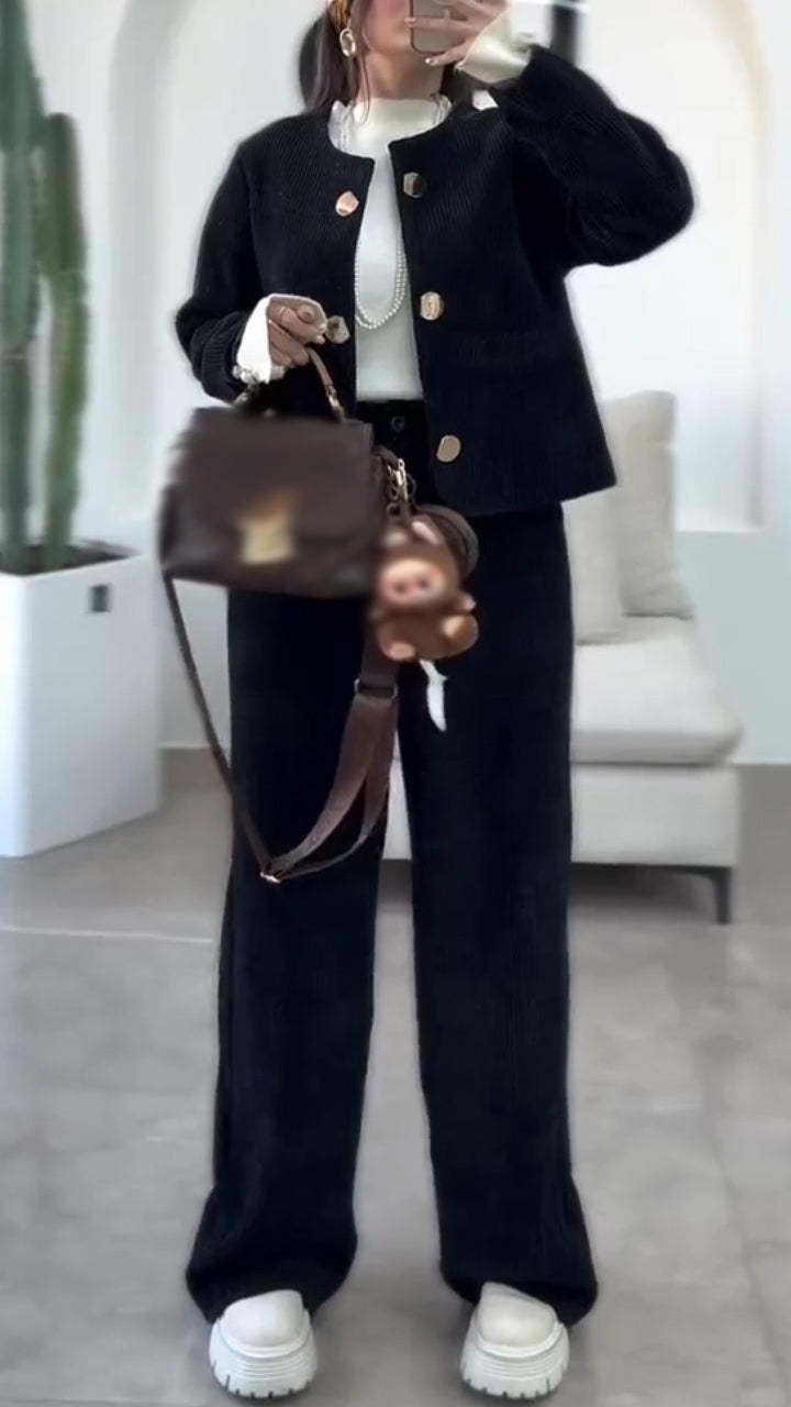 Women Round-neck Button-down Jacket + Pants Casual Suit
