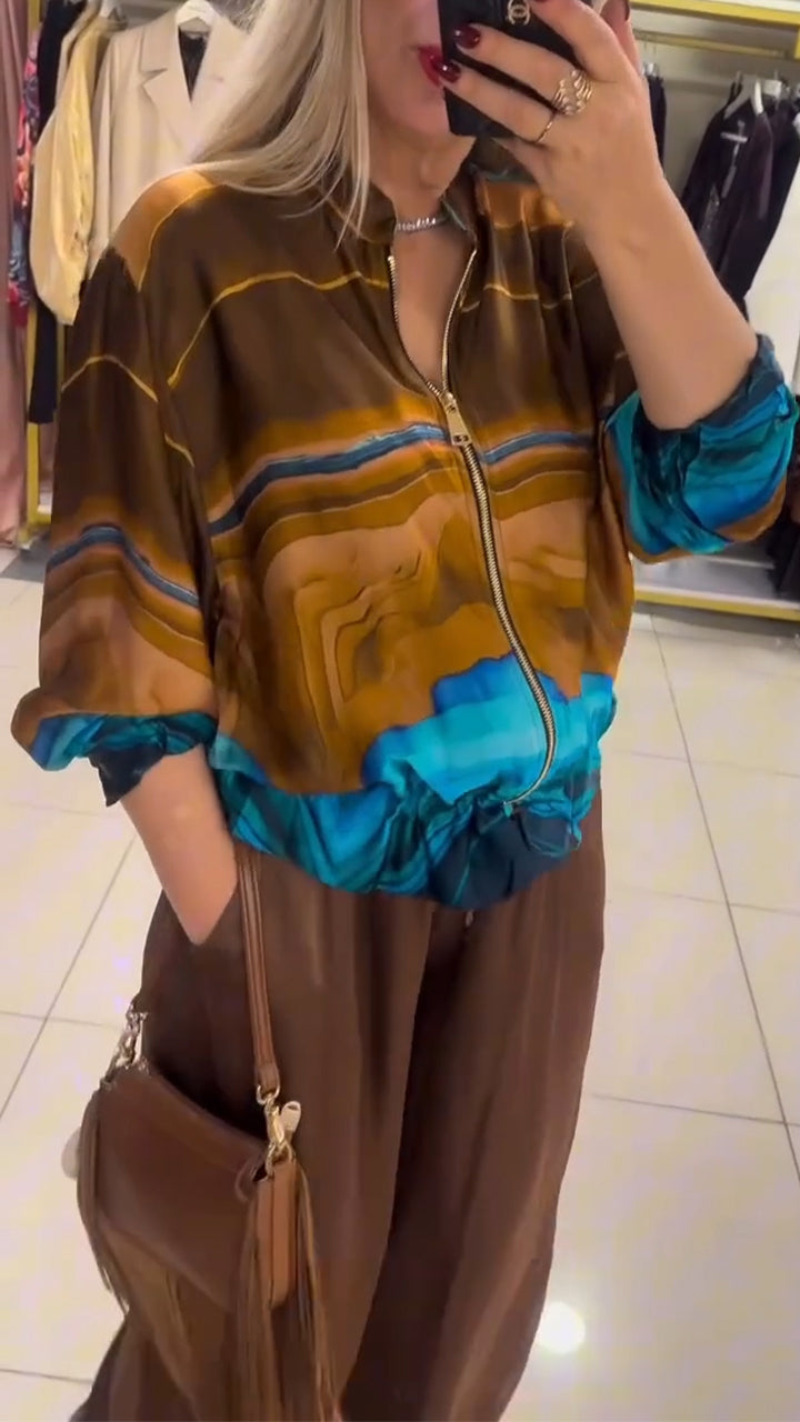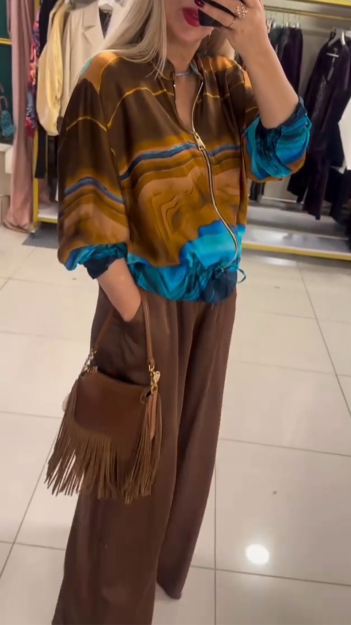 Women Round Neck Zippered Gradient Jacket + Pants Casual Suit