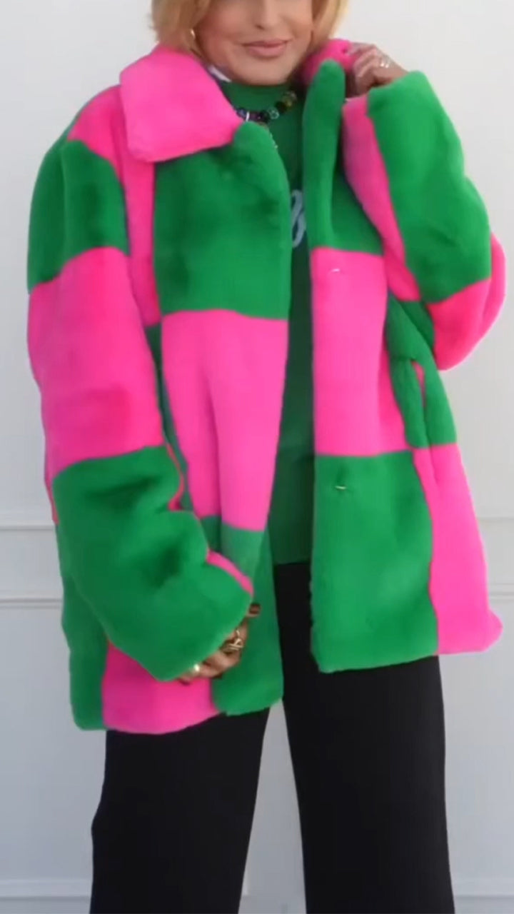 Women Lapel Contrast Color Plush Casual Coat
