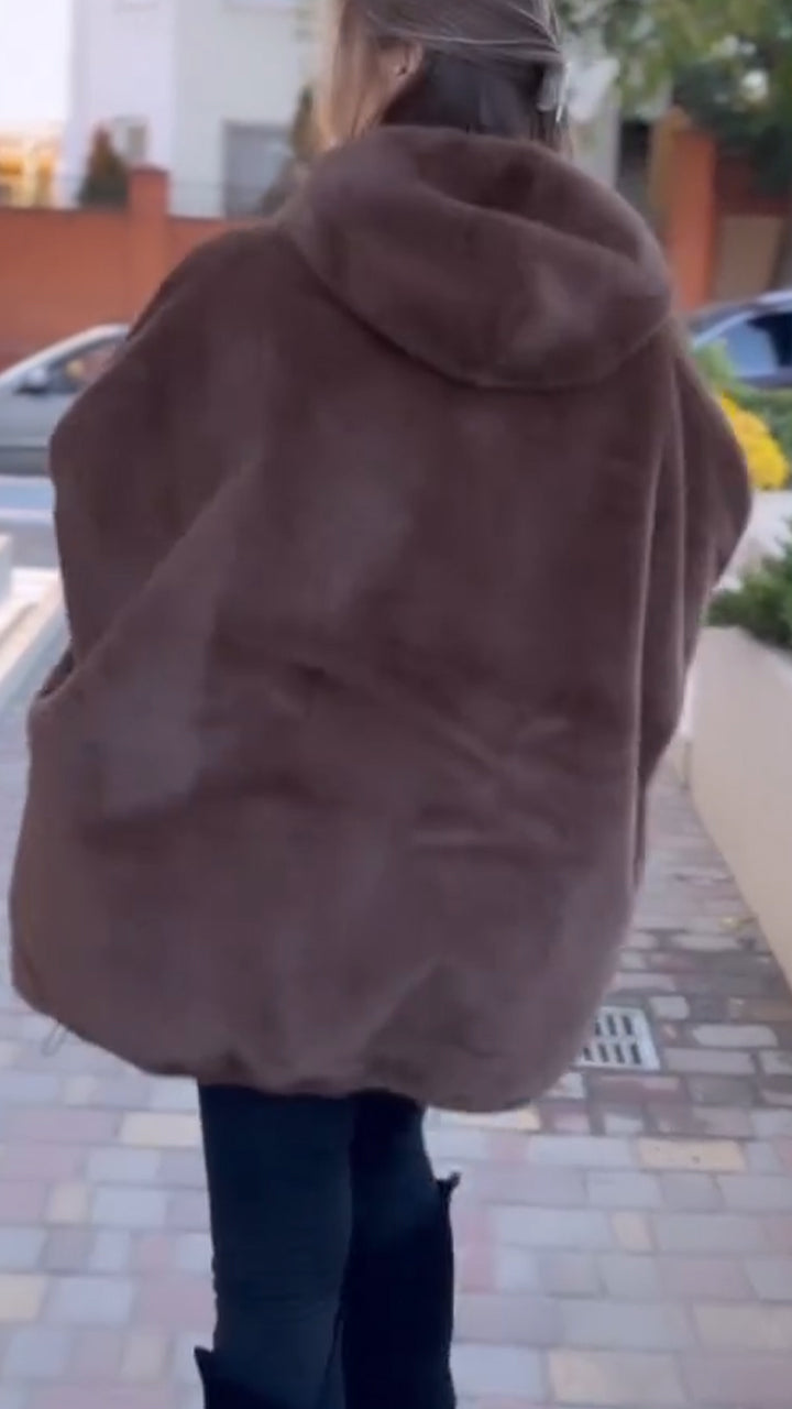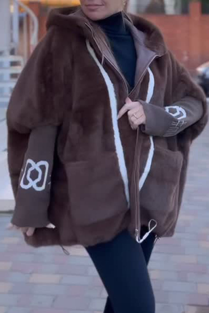 Women Hooded Patchwork Knit Printed Sleeve Casual Plush Coat