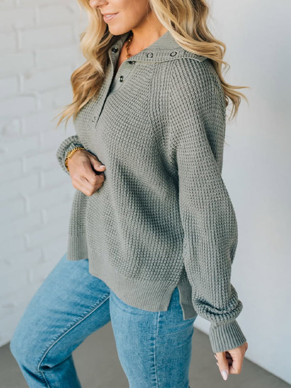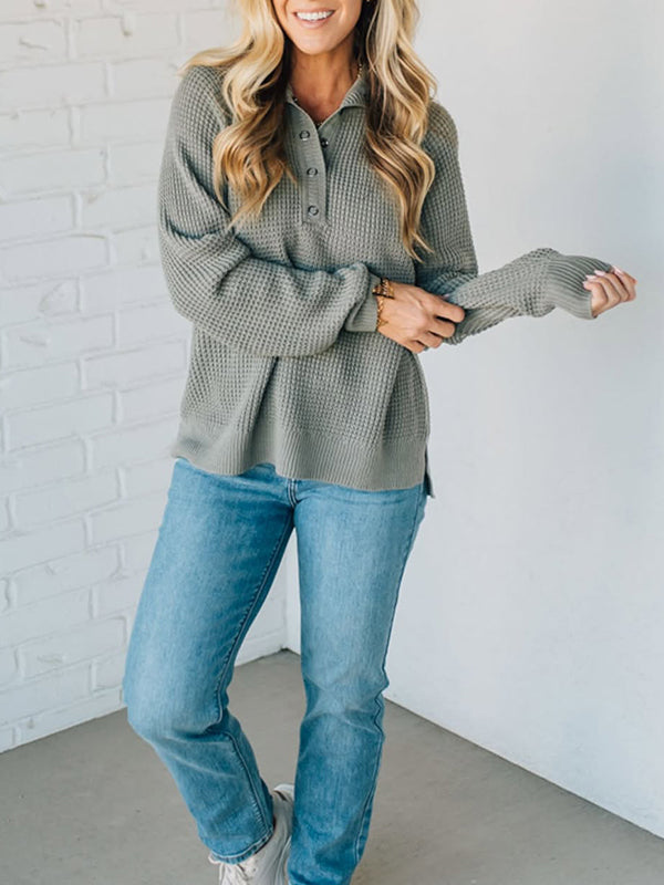 Women Lapel Buttoned Waffle Knit Casual Top