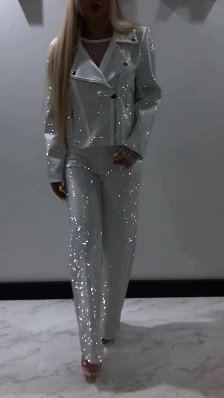 Women Laple Collar Hot Diamond Jacket+ Pants Sparkling Casual Set