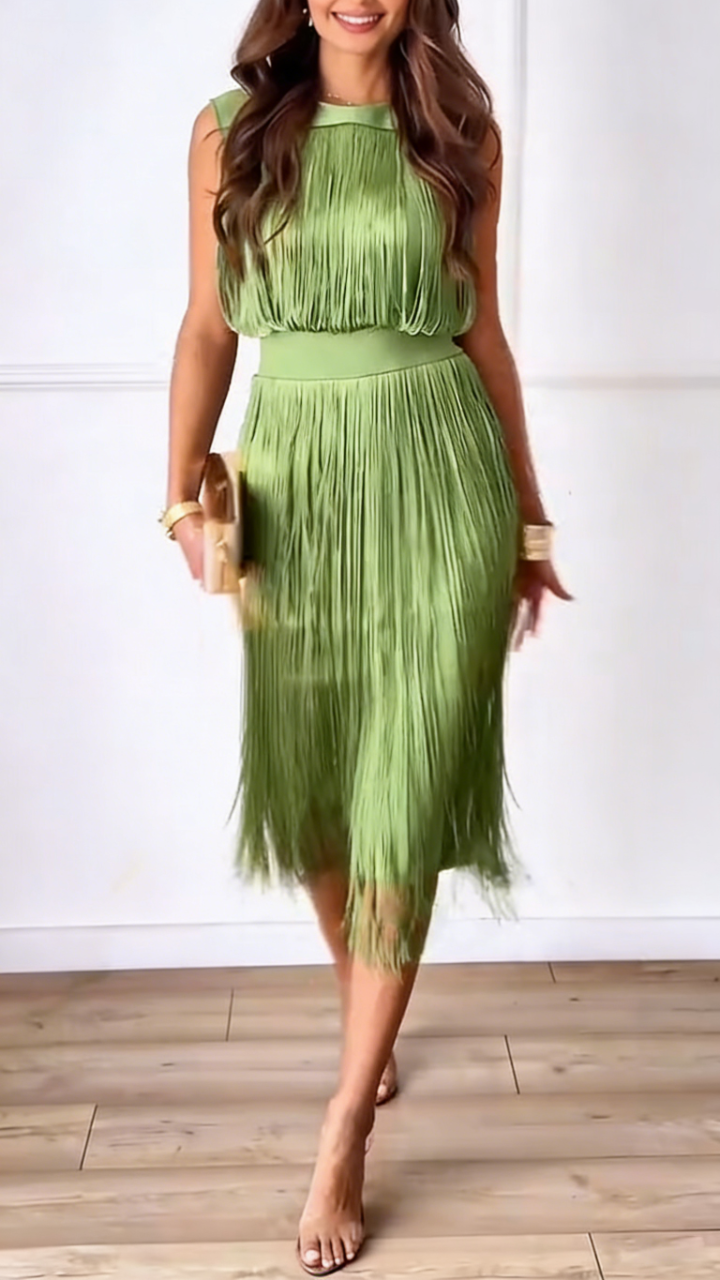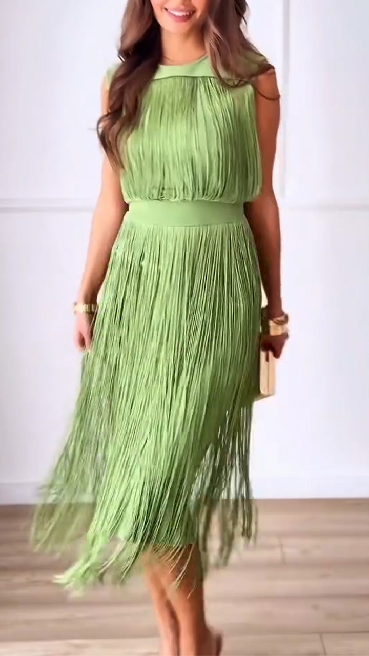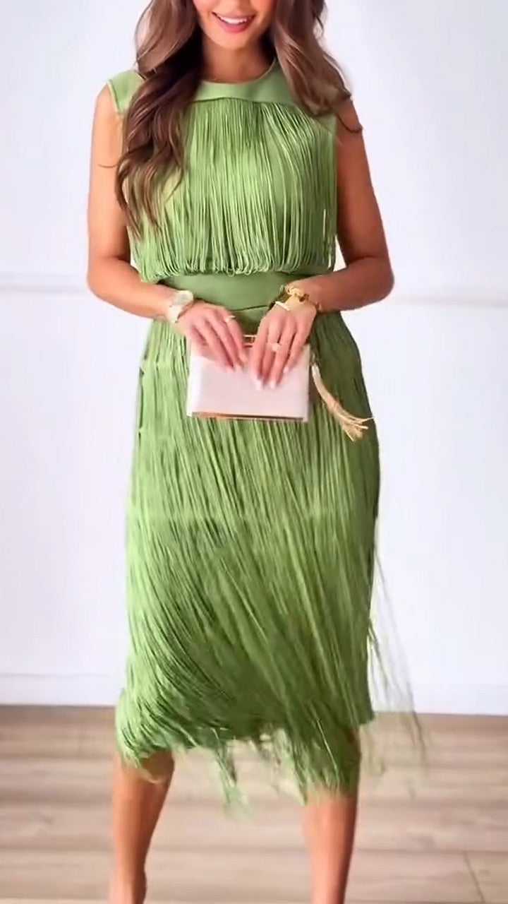 Women Round Neck Solid Color Patchwork Tassel Elegant Temperament Dress