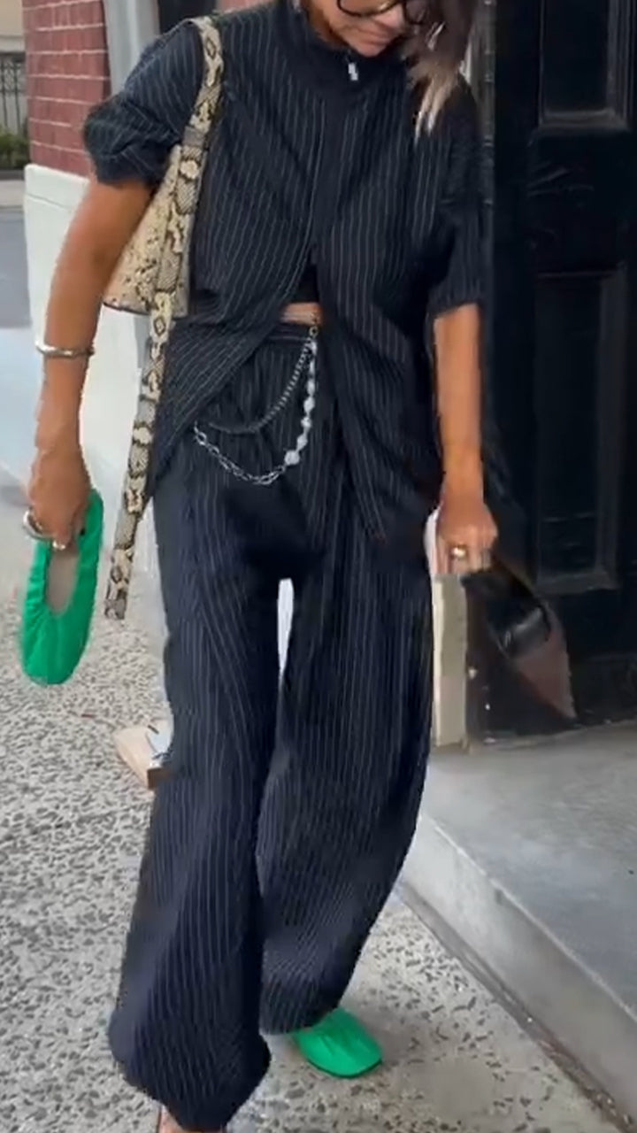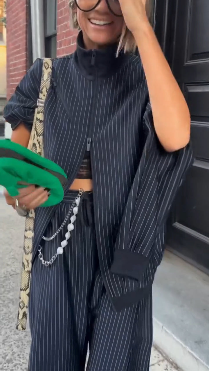 Women Stand-collar Striped Jacket and Pants Casual Set