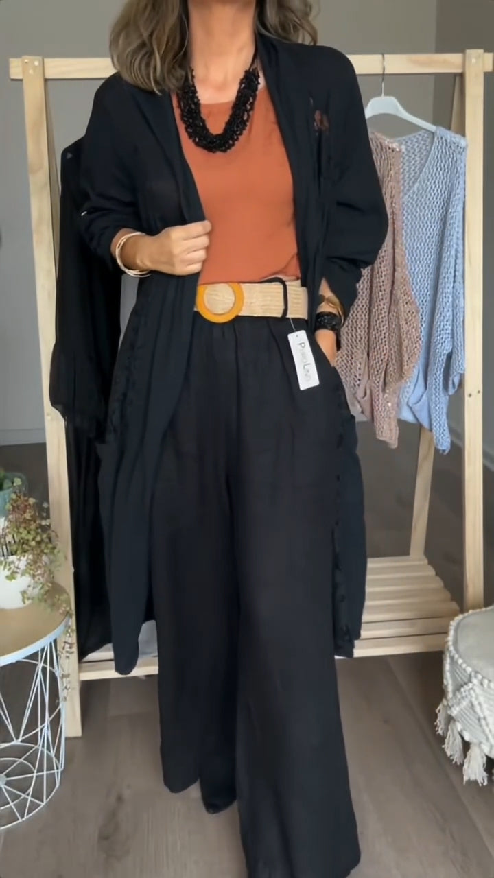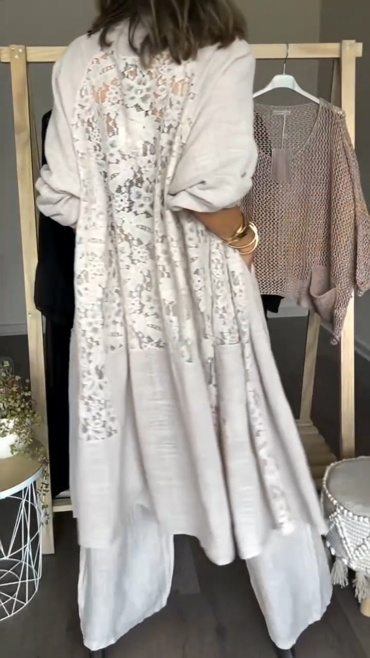 Womens Long Patterned Openwork Cardigan + Trousers Casual Set