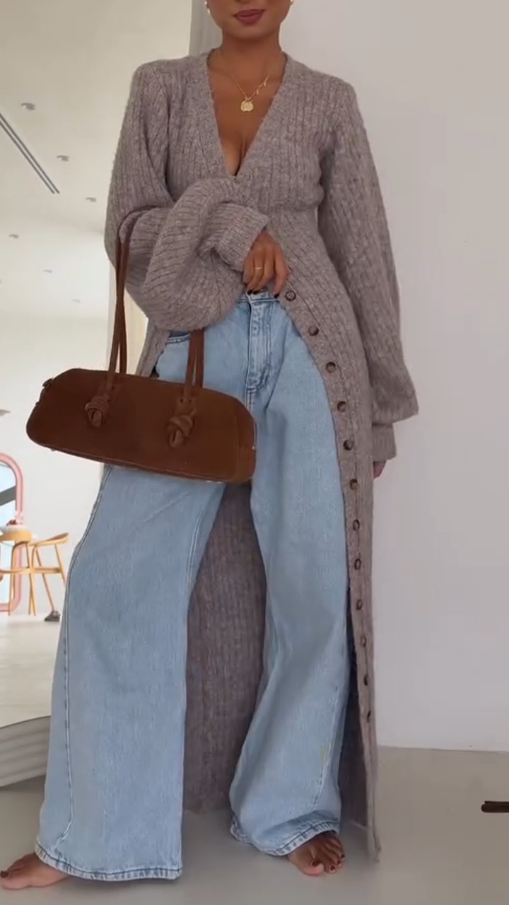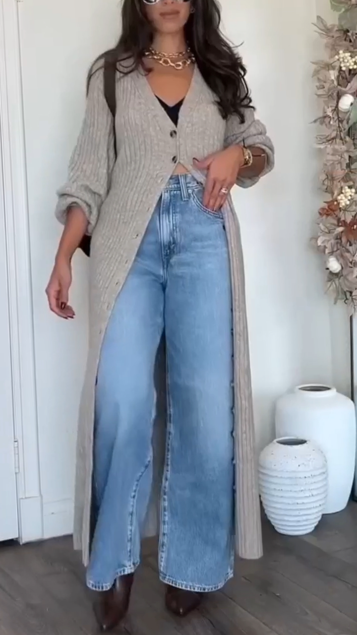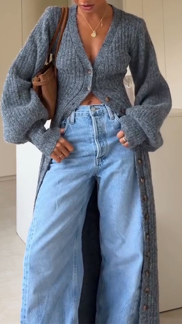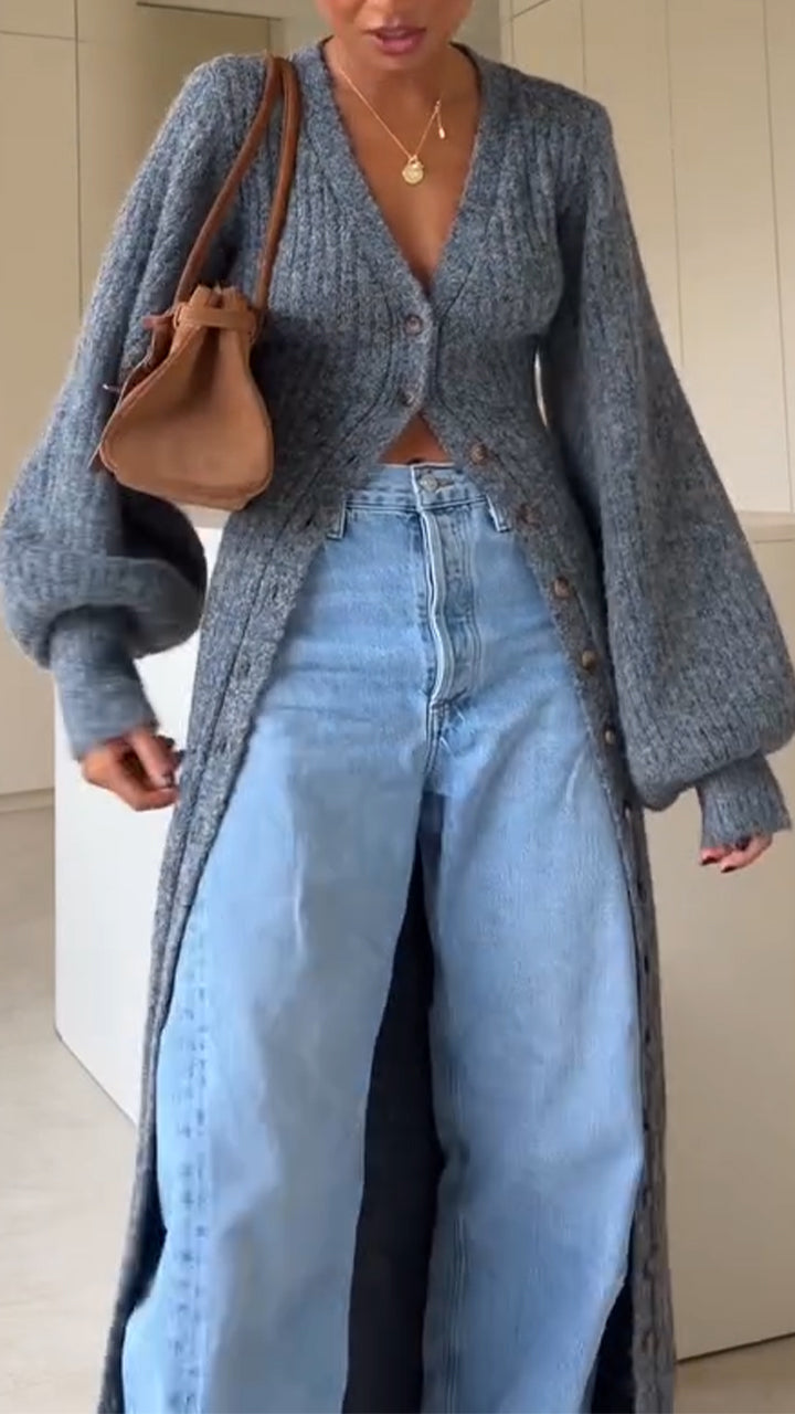 Women Knitted Long Cardigan+ Jeans Casual Suit