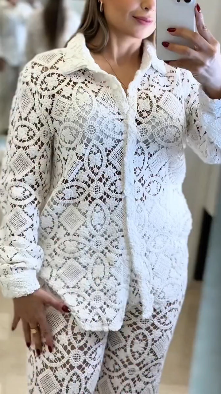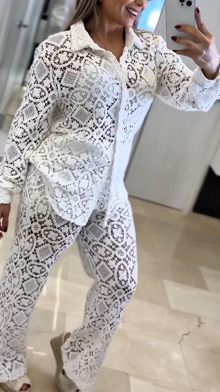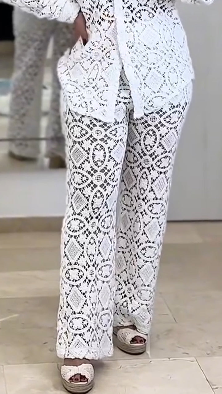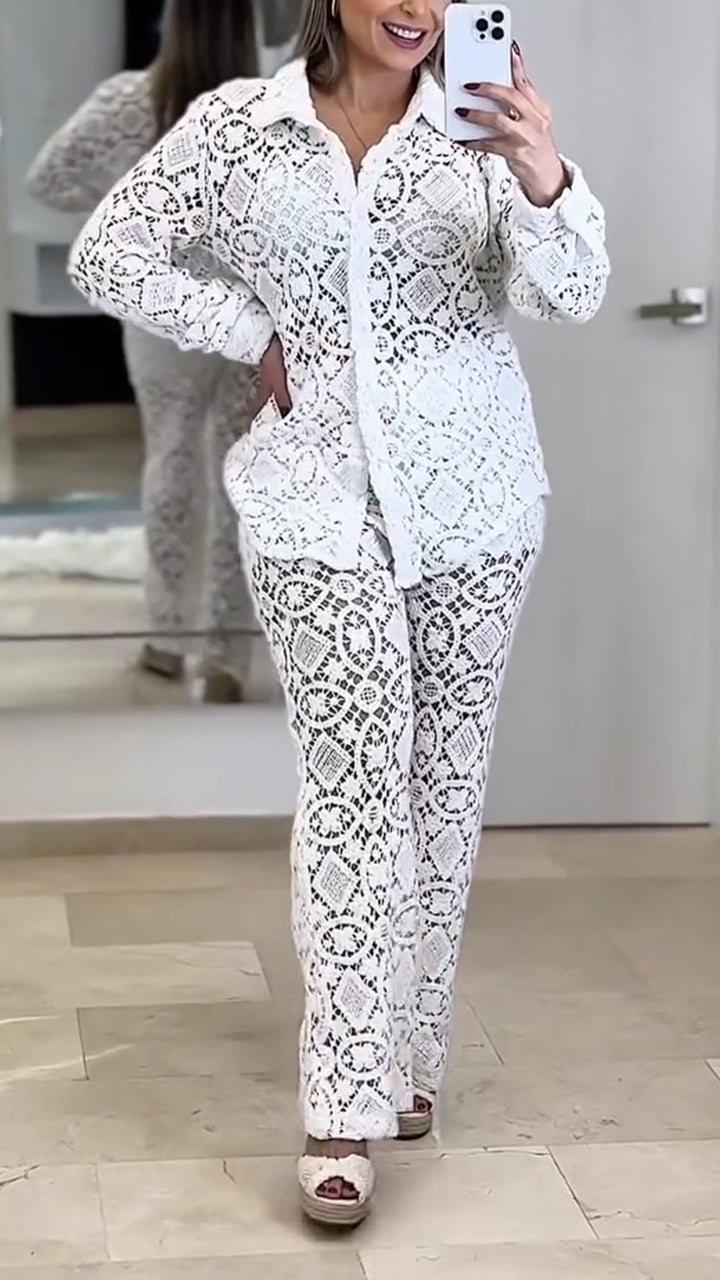 Women Laple Collar Pattern Hollow Solid Color Casual Suit