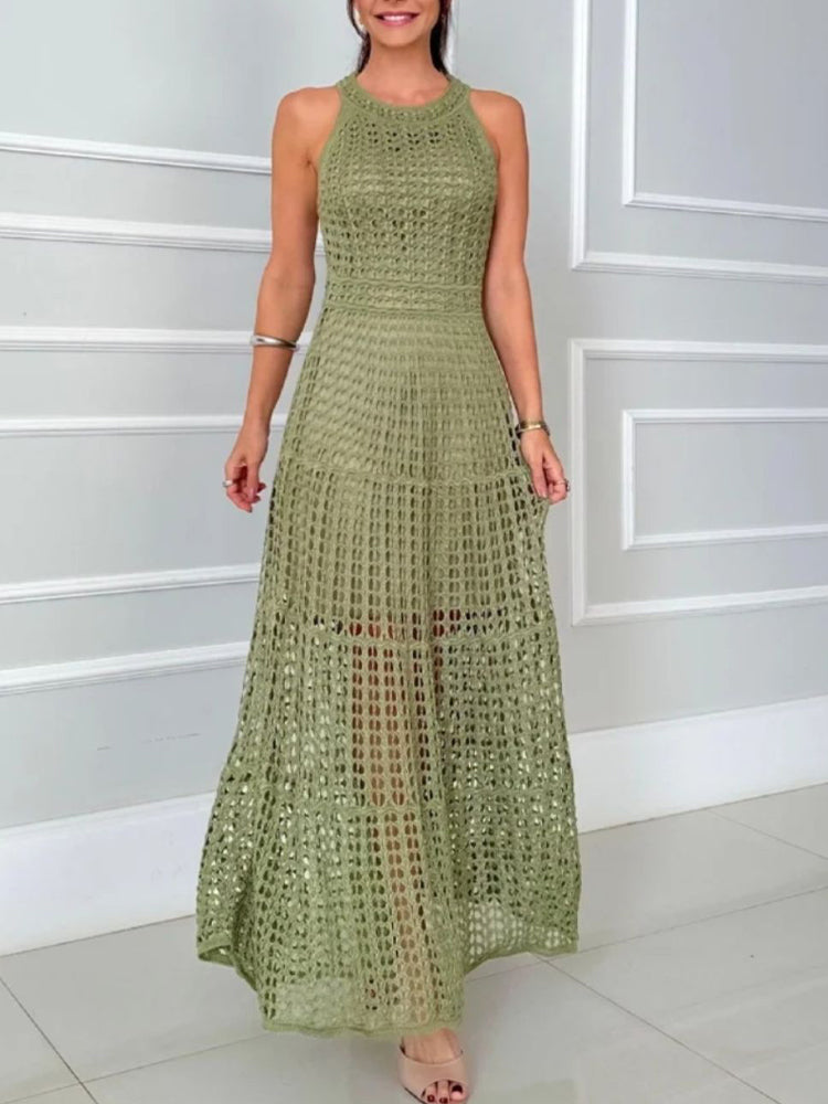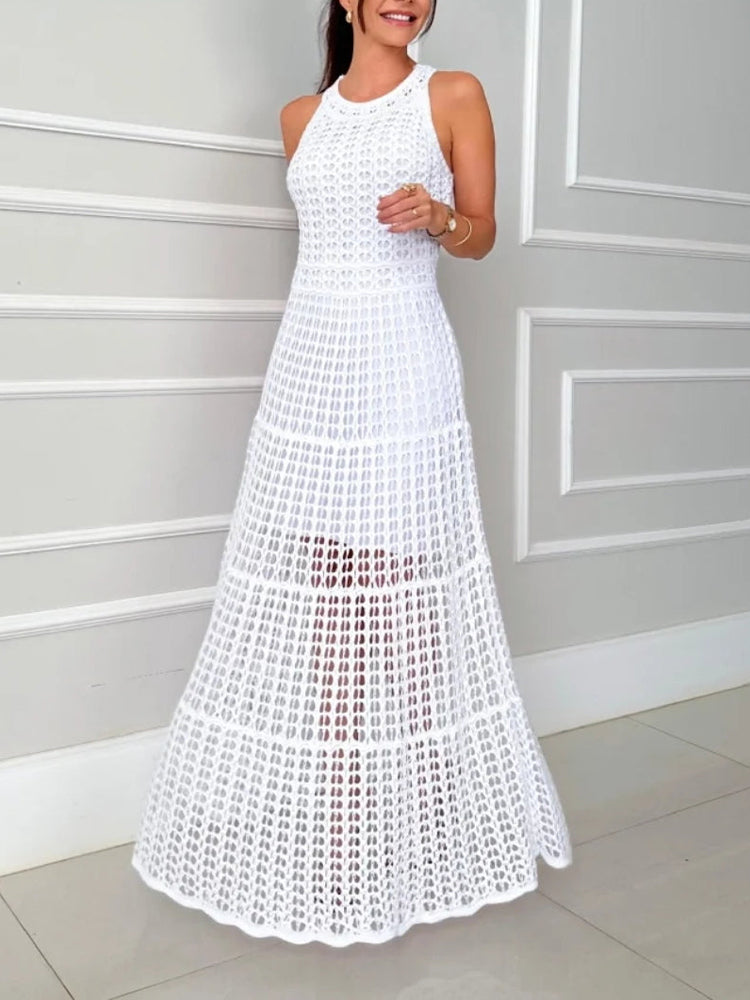 Women Round Neck Hollow Out Casual Dress