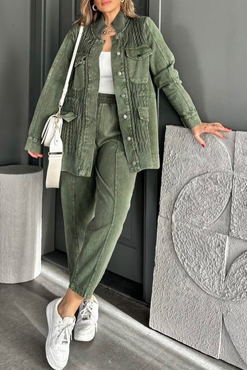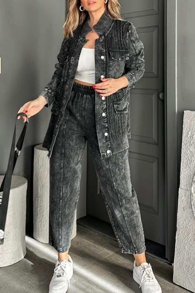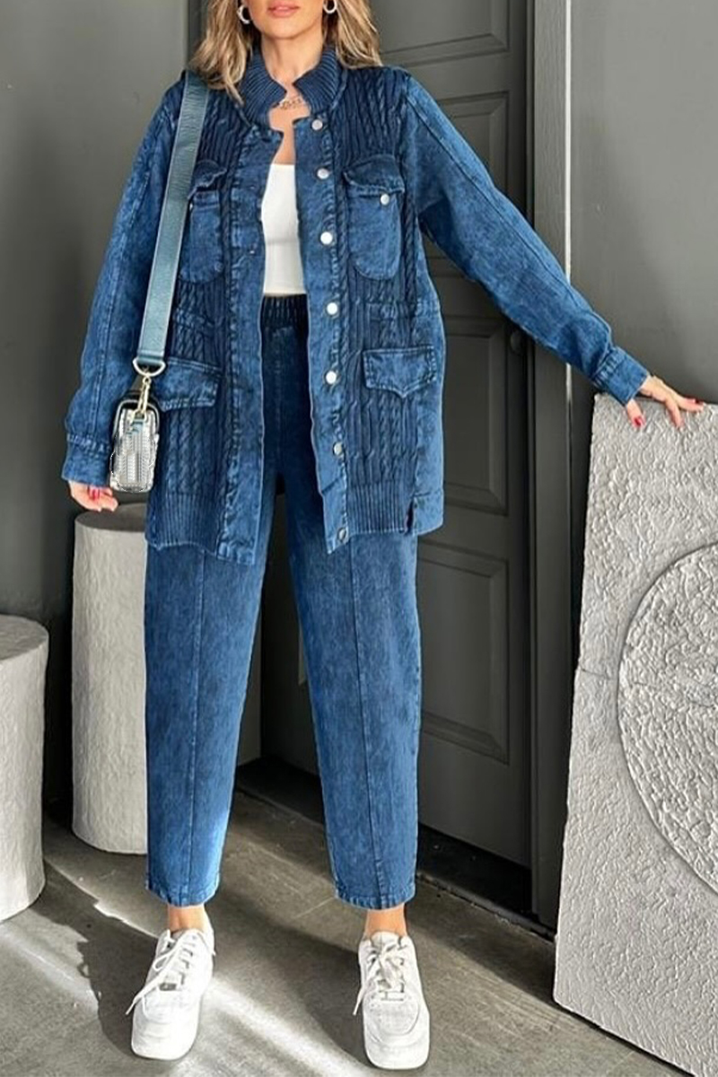 Women Round Neck Patchwork Breasted Jacket+ Pants Casual Set