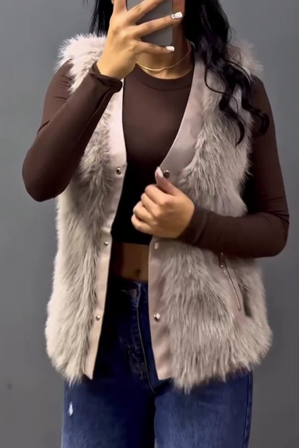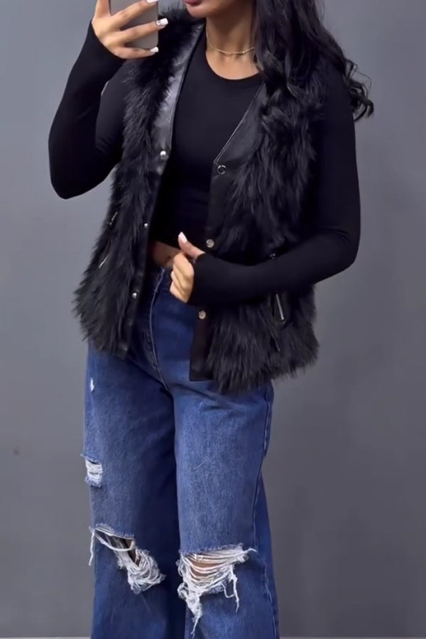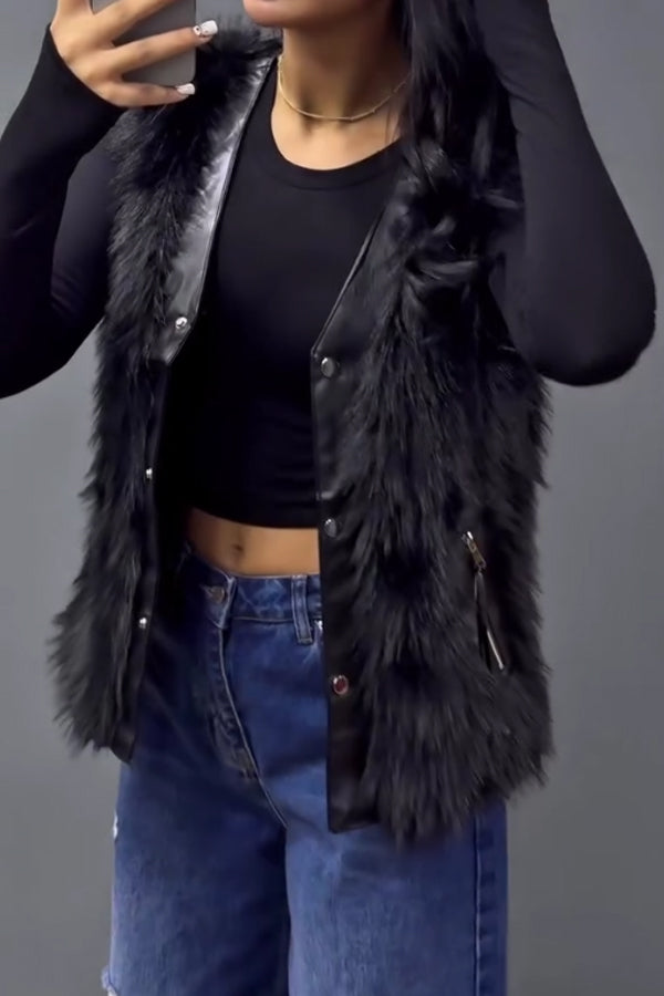 Women Casual Leather Panel Plush Zipper Pocket Vest Jacket