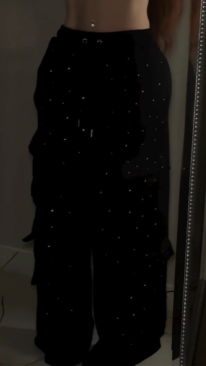Women Drawstring Patchwork Pocket Rhinestone Casual Pants