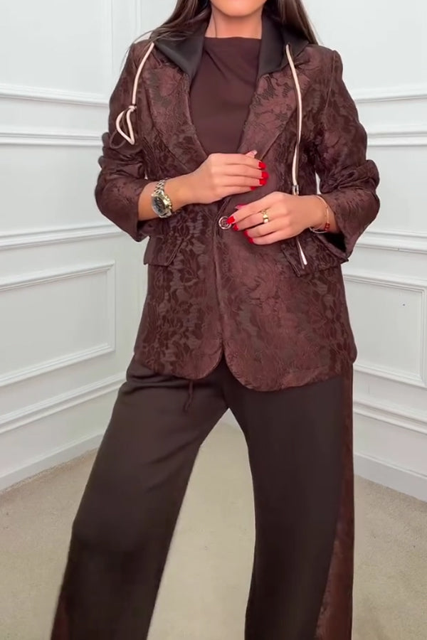 Women Elegant Floral Pattern Hooded Drawstring Blazer + Pants Suit