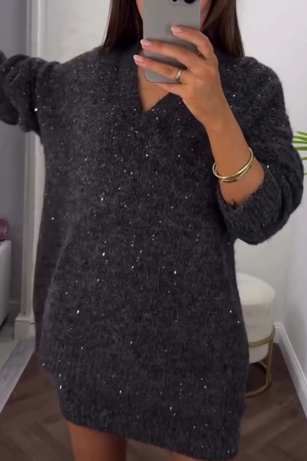 Women Elegant Shiny Loose Sweater + Skirt Suit