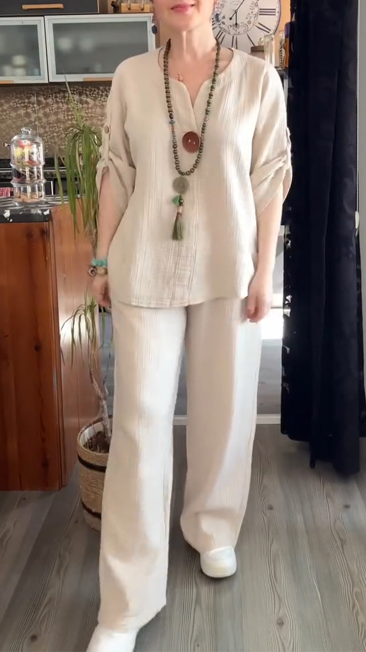 Women Collar Hollow Lace Pattern Top+ Pants Casual Suit