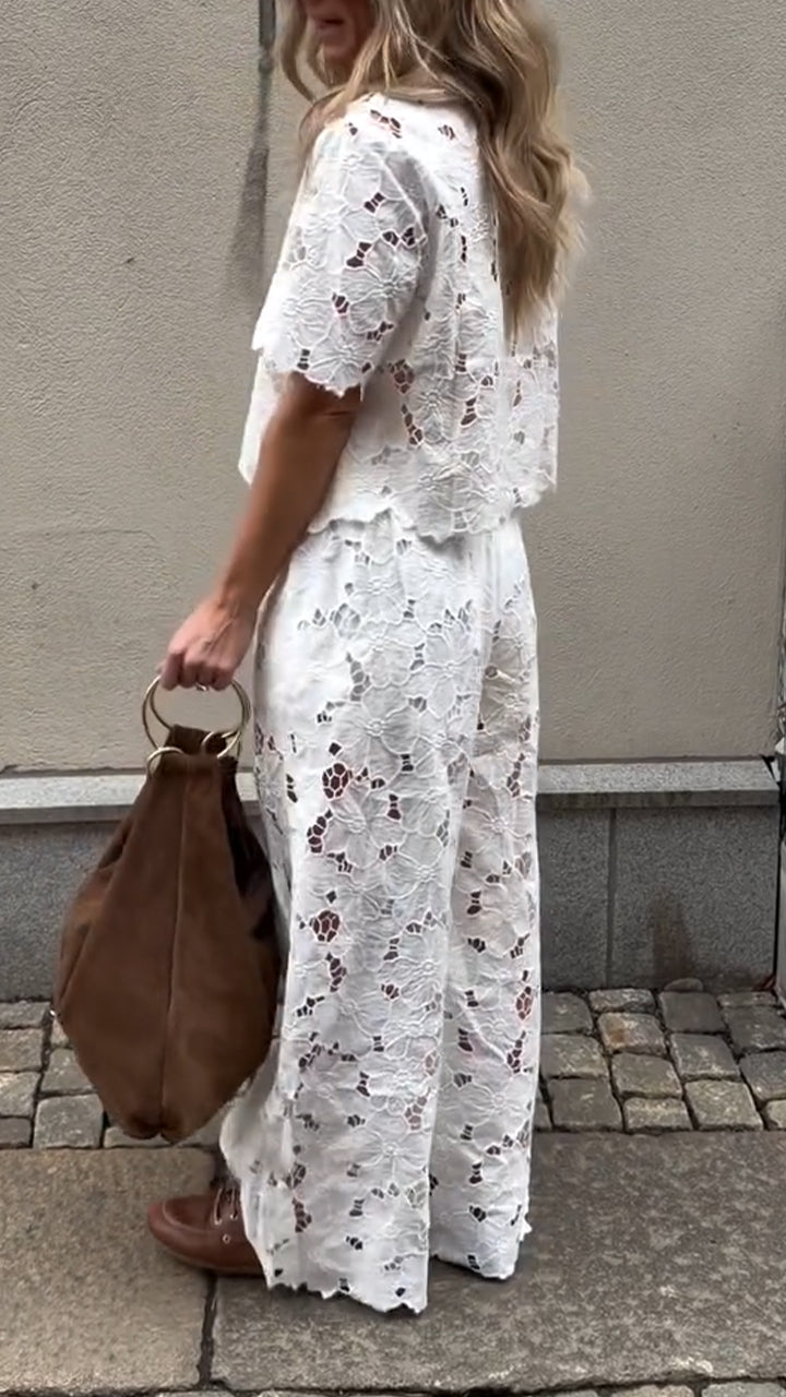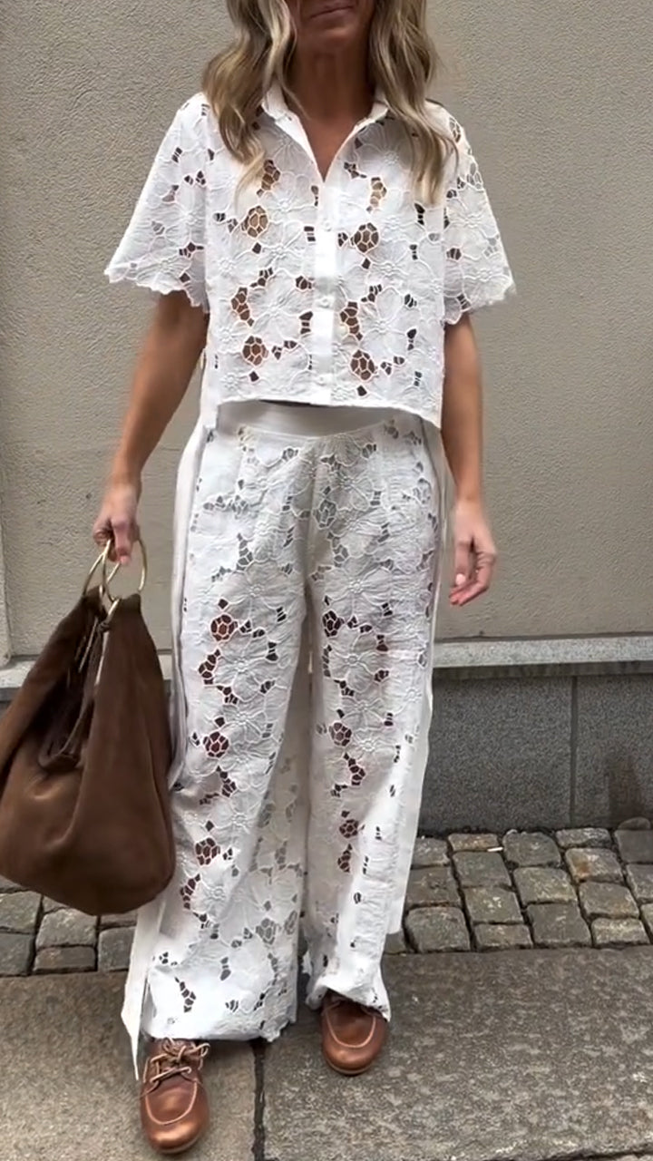 Women Collar Flower Pattern Hollow Leisure Set