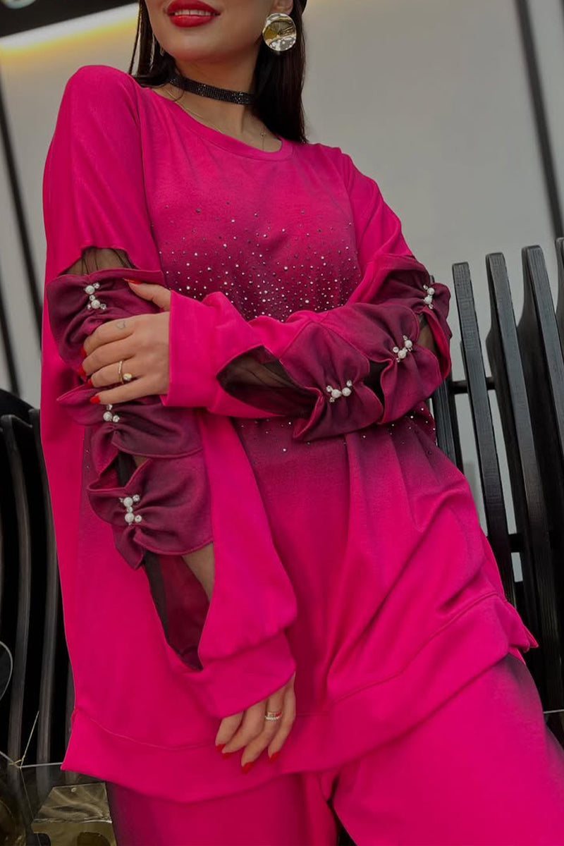Women Round Neck Hot Diamond Mesh Splicing Bow Sleeves + Pants Casual Suit