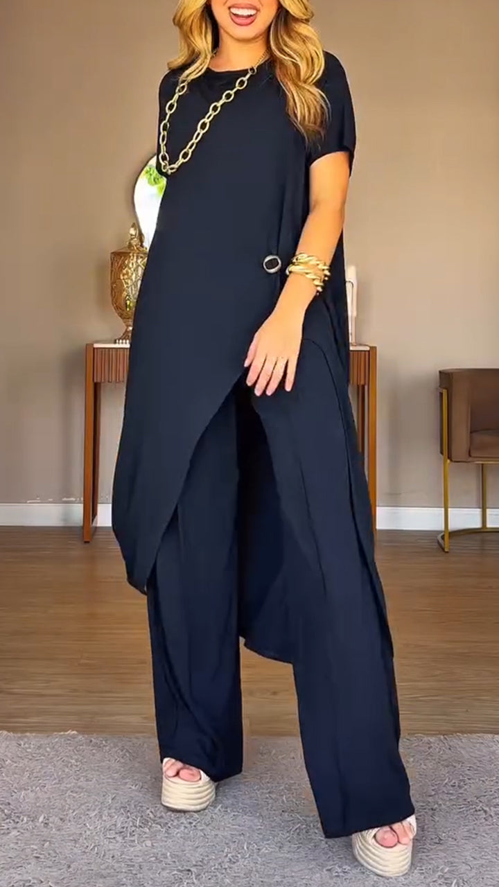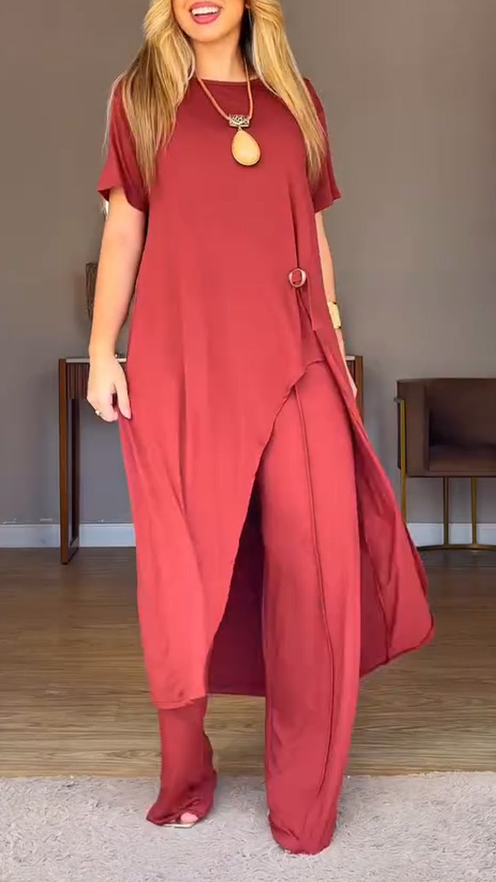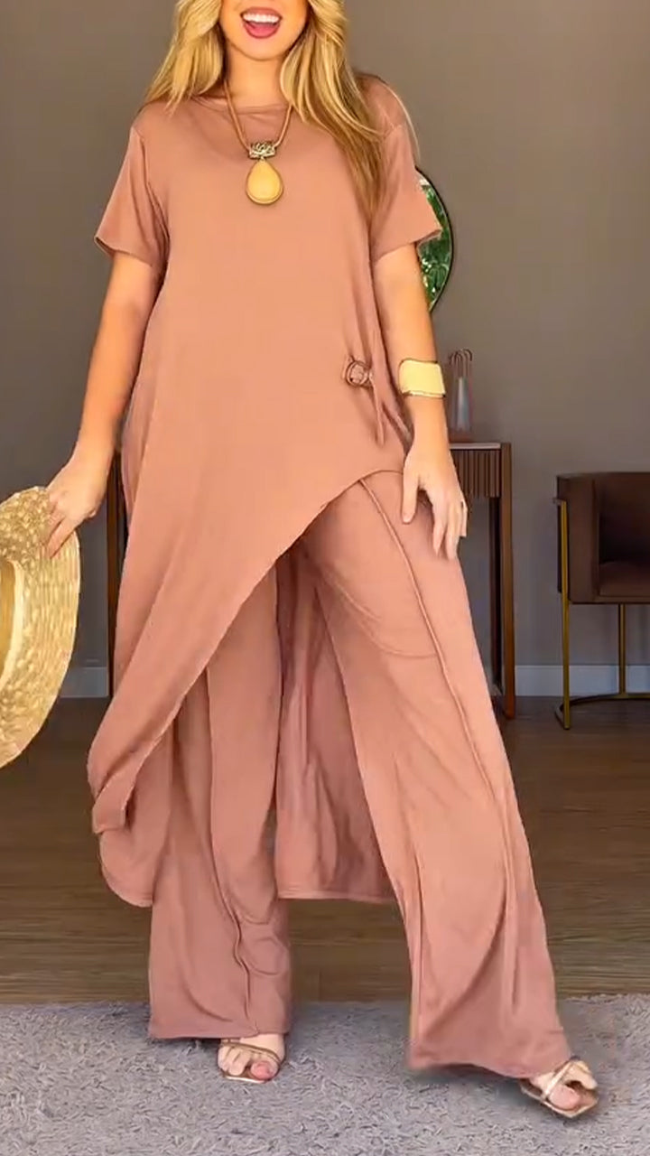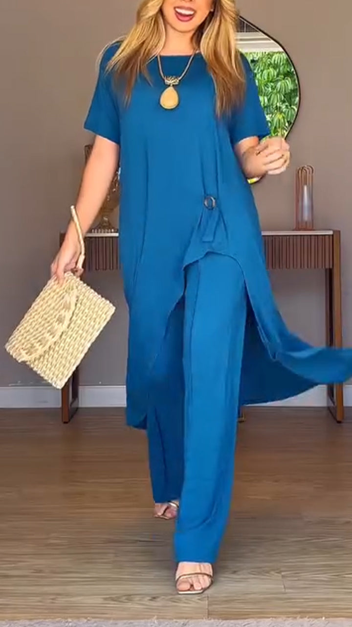 Women Round Neck Irregular Long Top + Pants Casual Suit