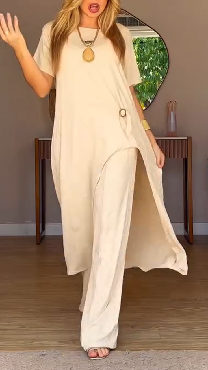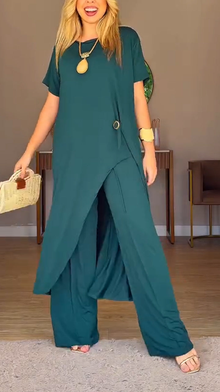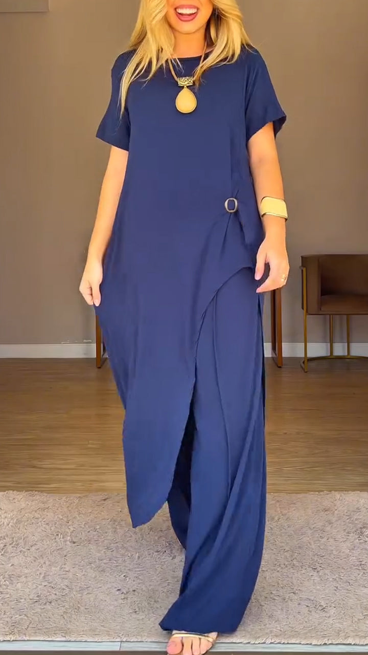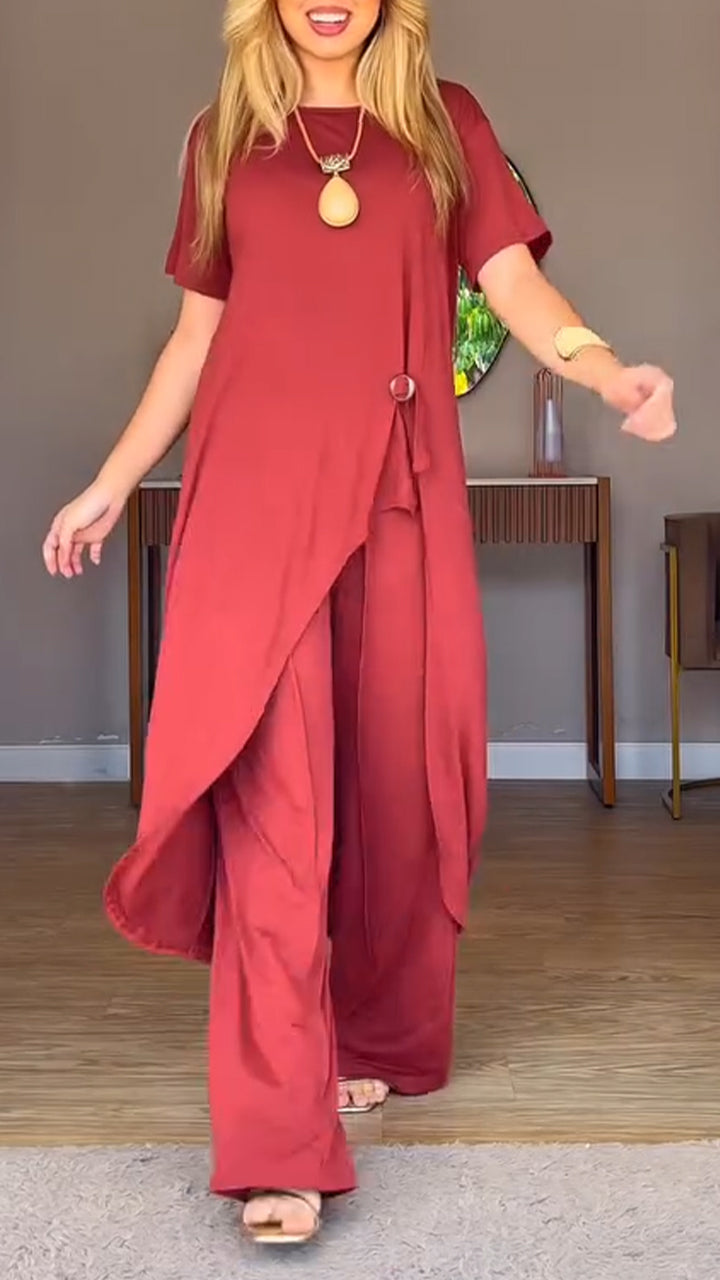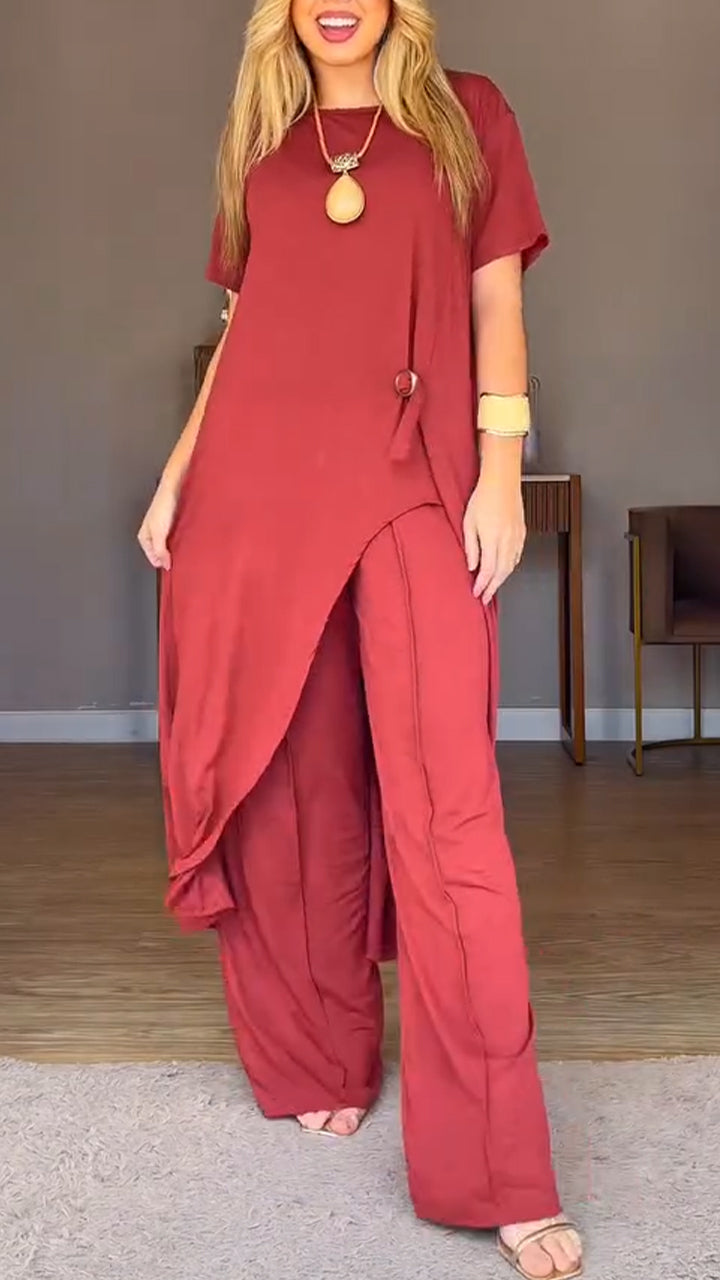 Women Round Neck Irregular Long Top + Pants Casual Suit