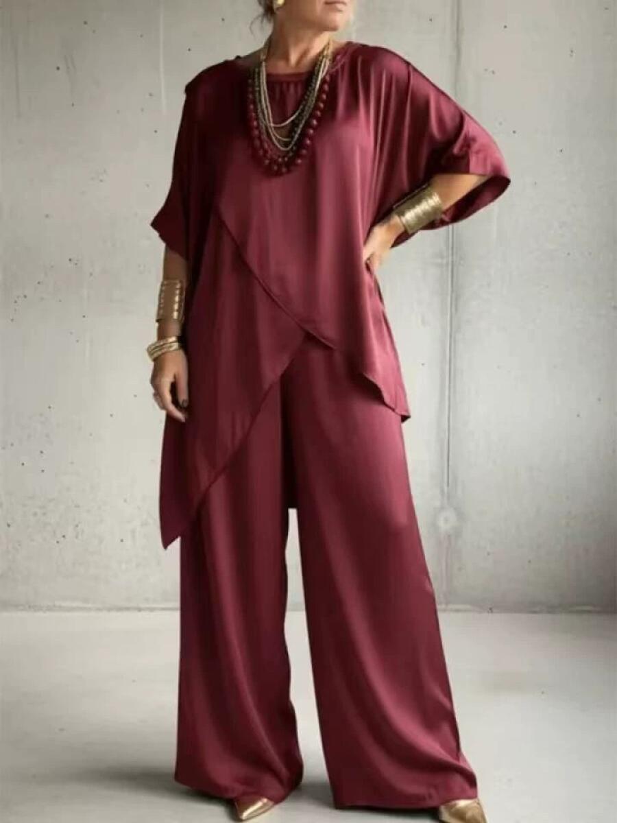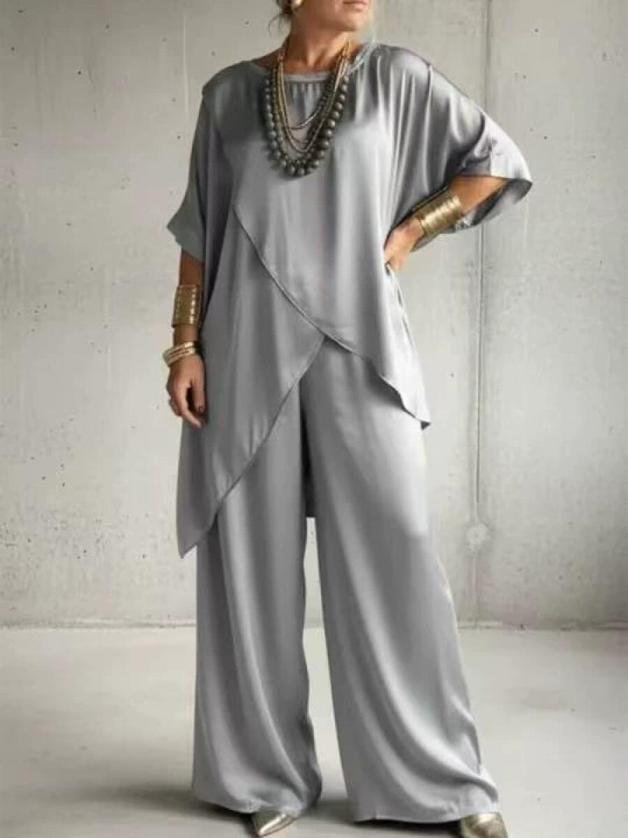 Women Round Neck Irregular Top + Pants Satin Solid Color Casual Suit