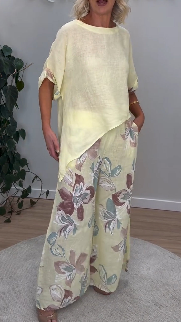 Women Round Neck Irregular Top+ Printed Pants Casual Suit
