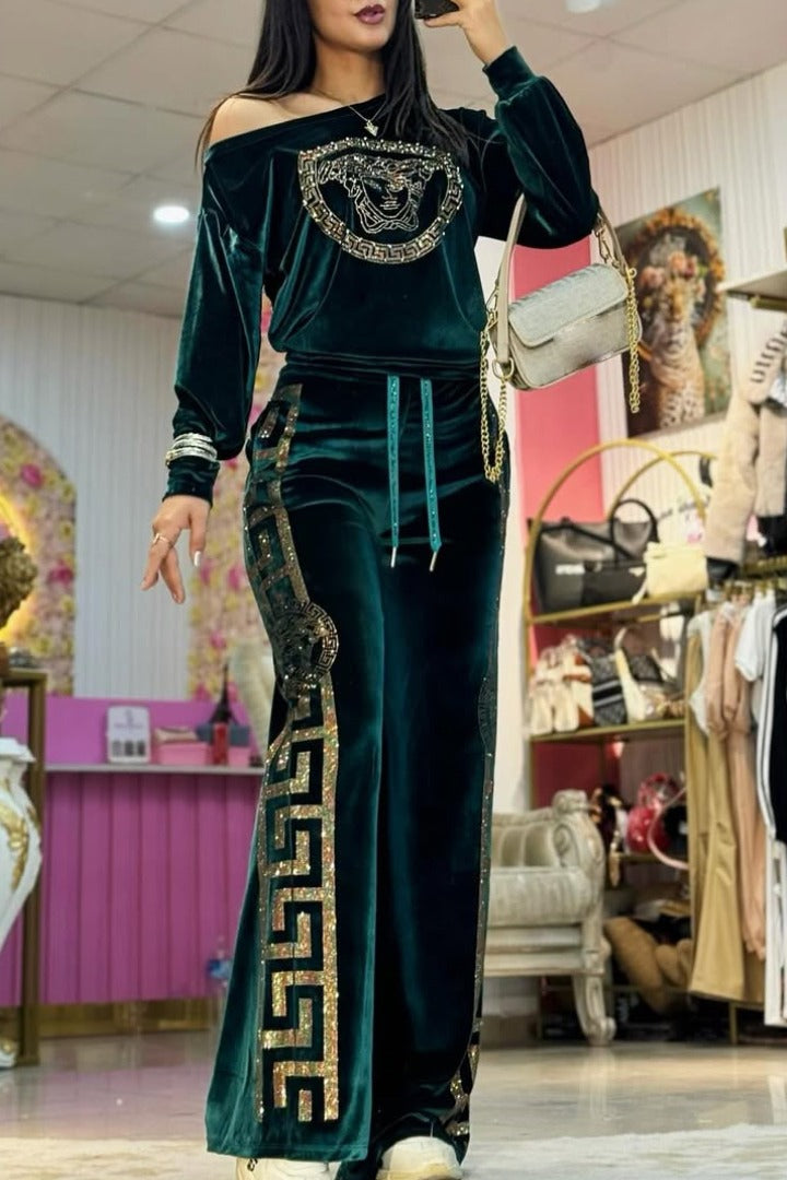Women Round Neck Irregular Top+ Printed Pants Casual Suit