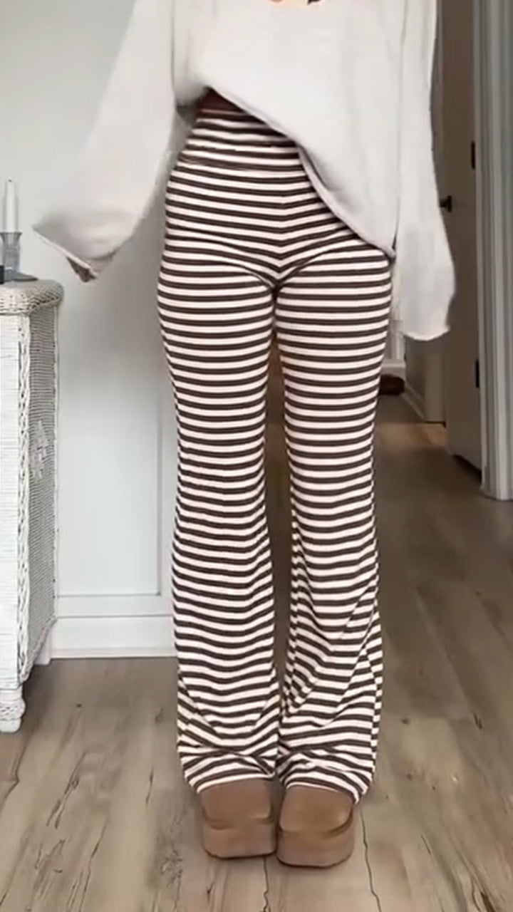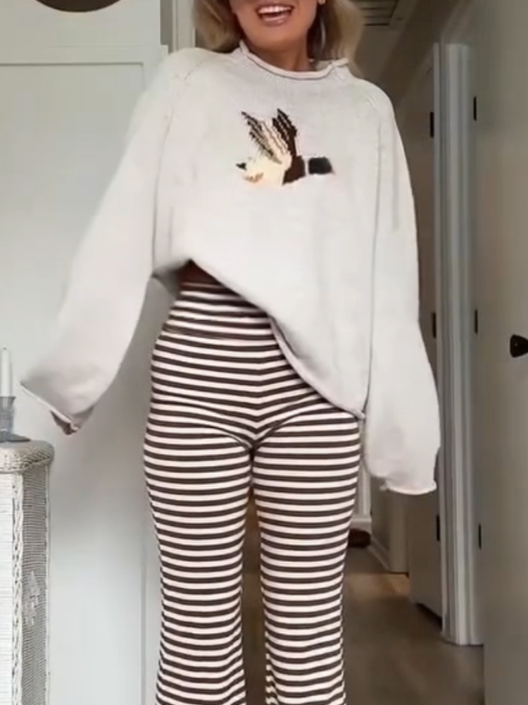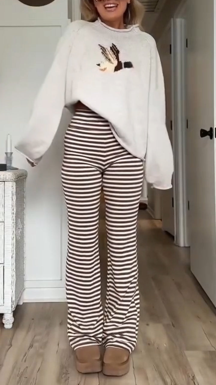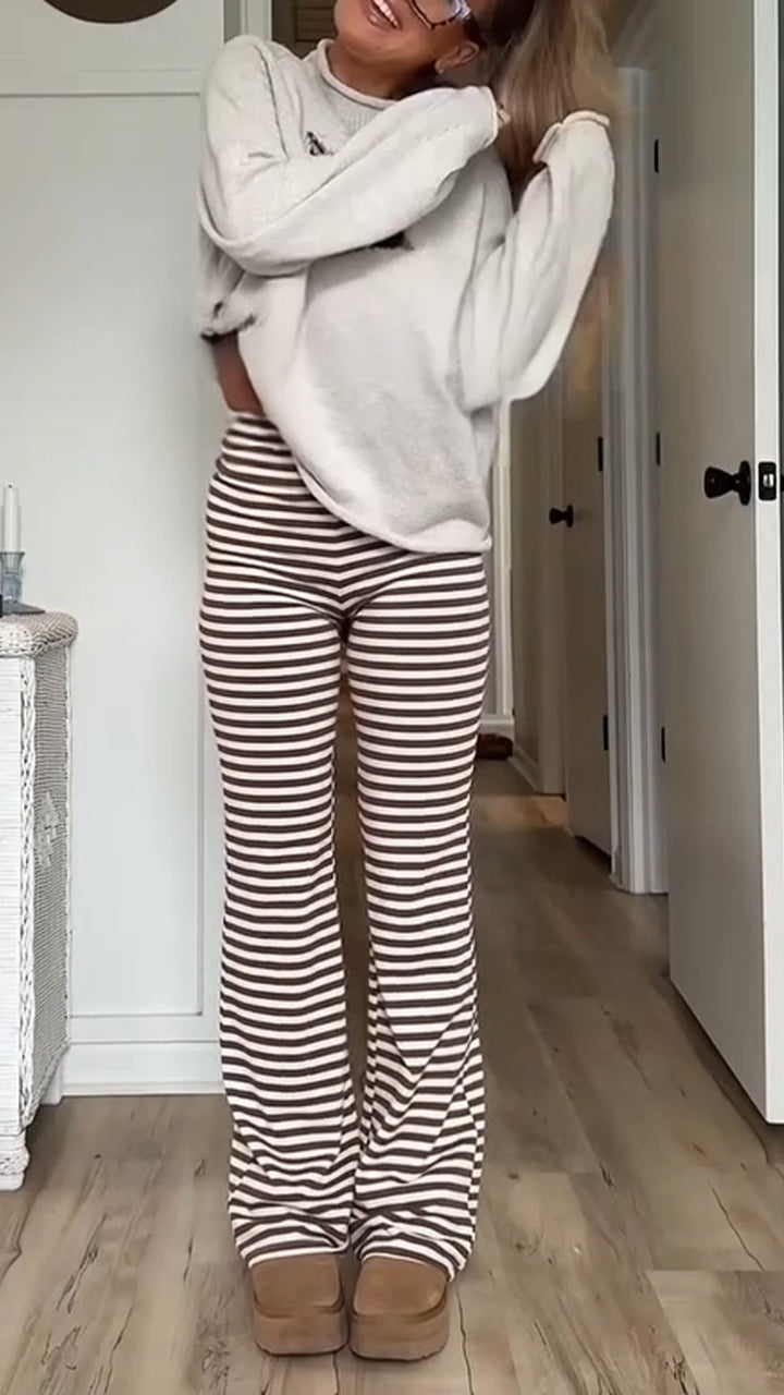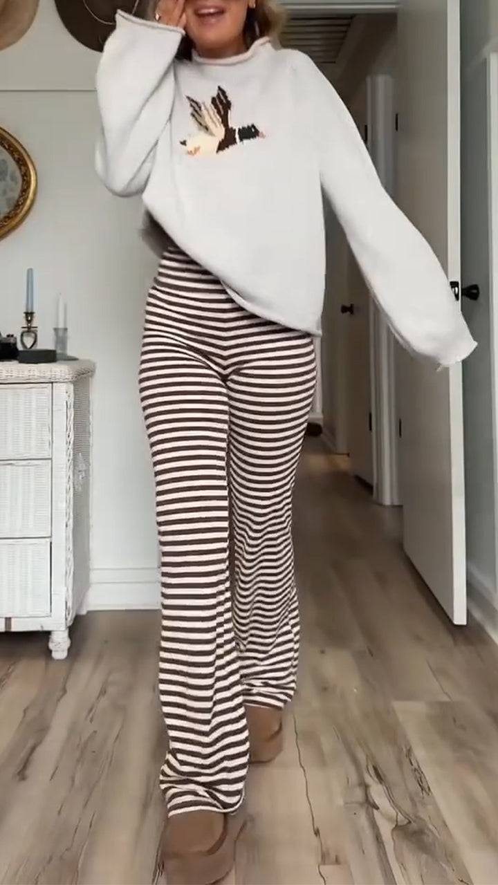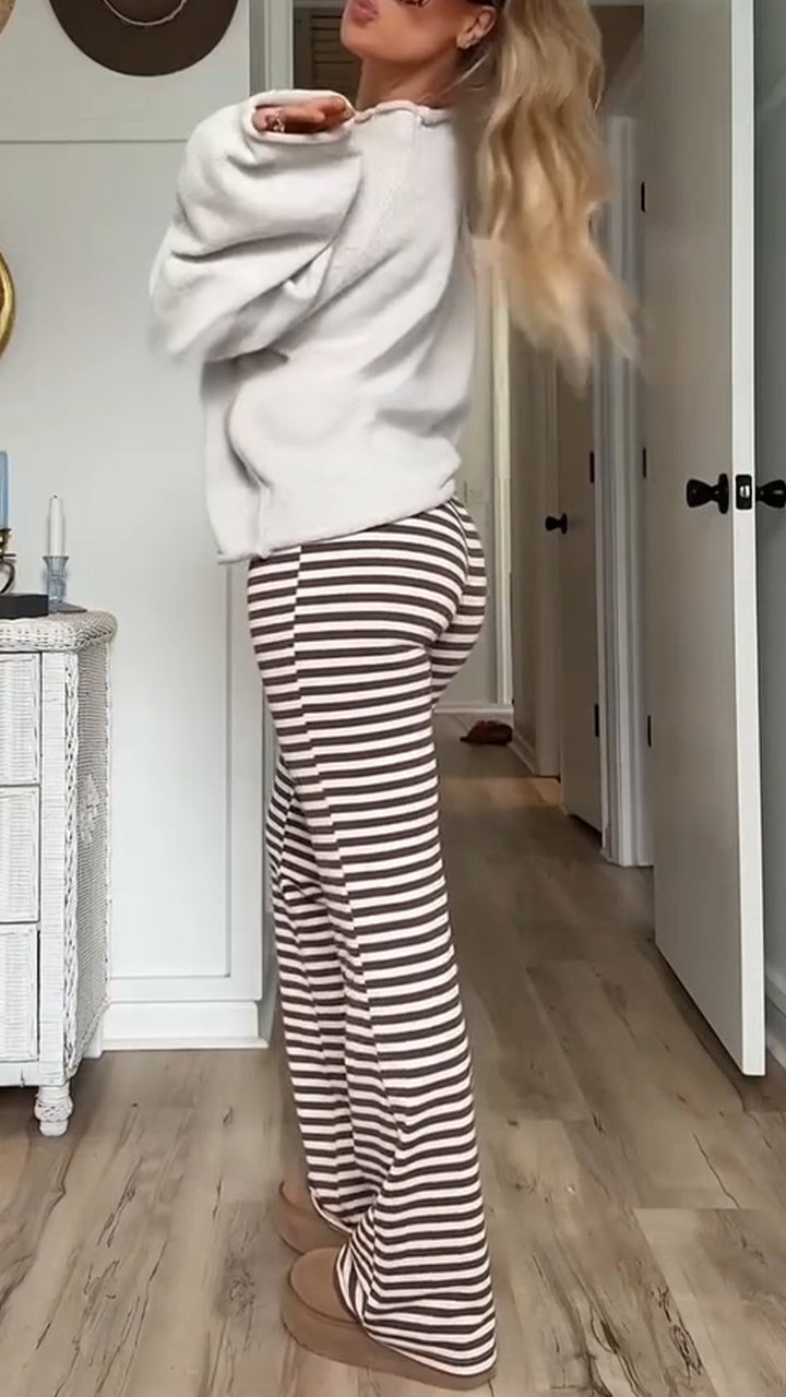 Women Round Neck Sweatshirt + Striped Pants Casual Suit