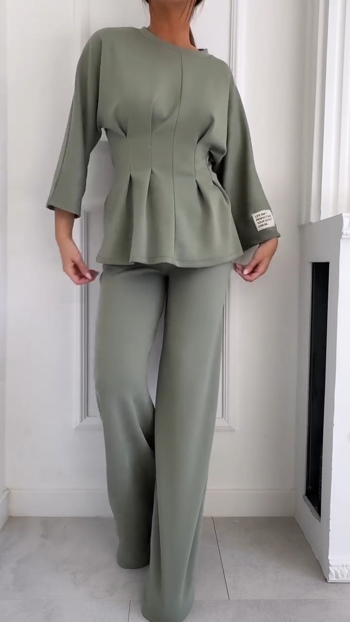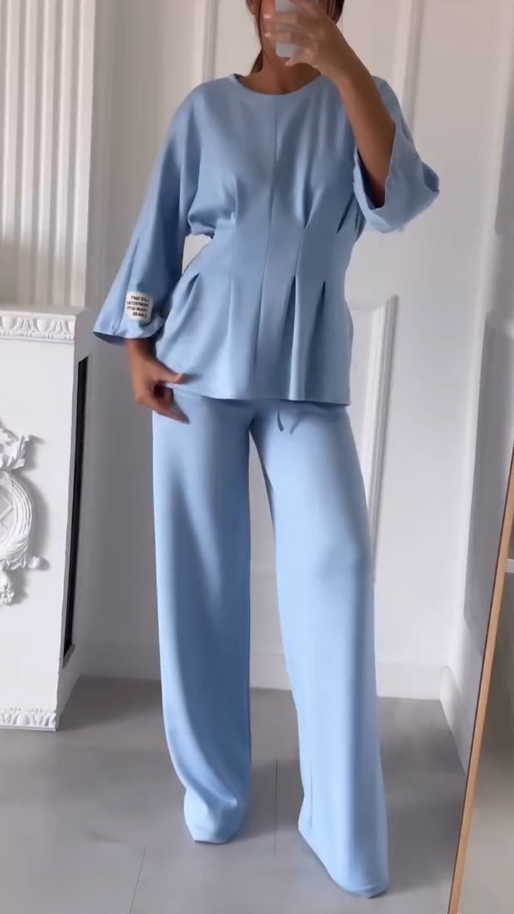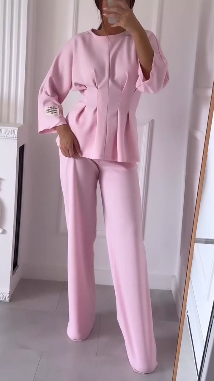 Women Round Neck Waist Cinched Top + Pants Casual Suit