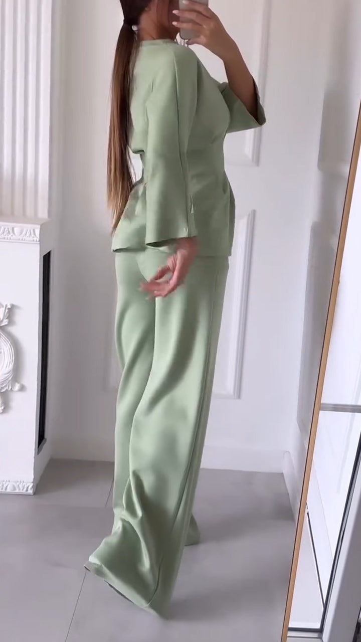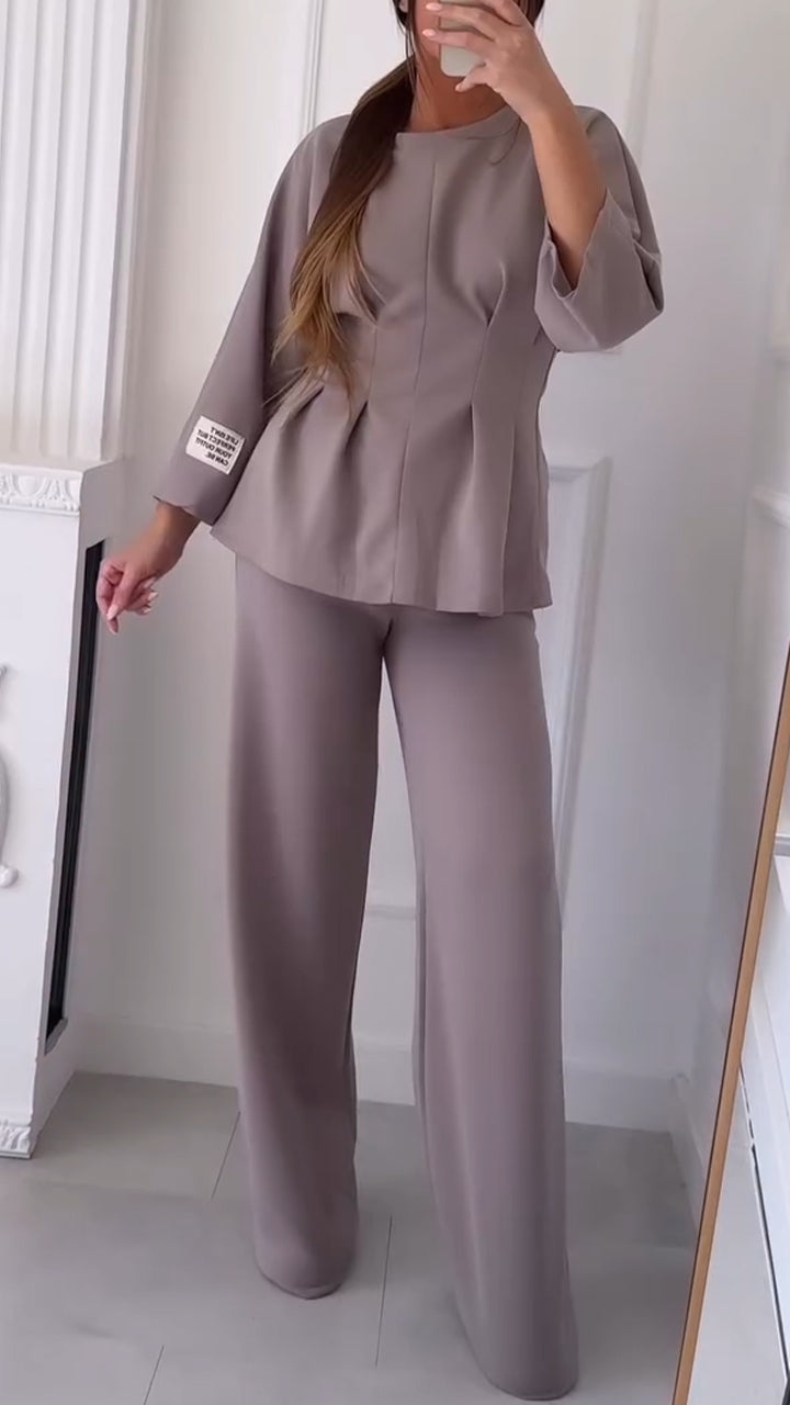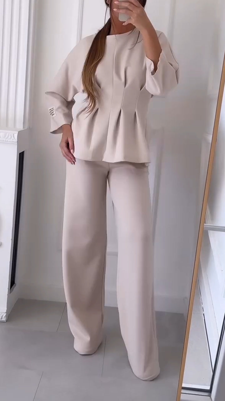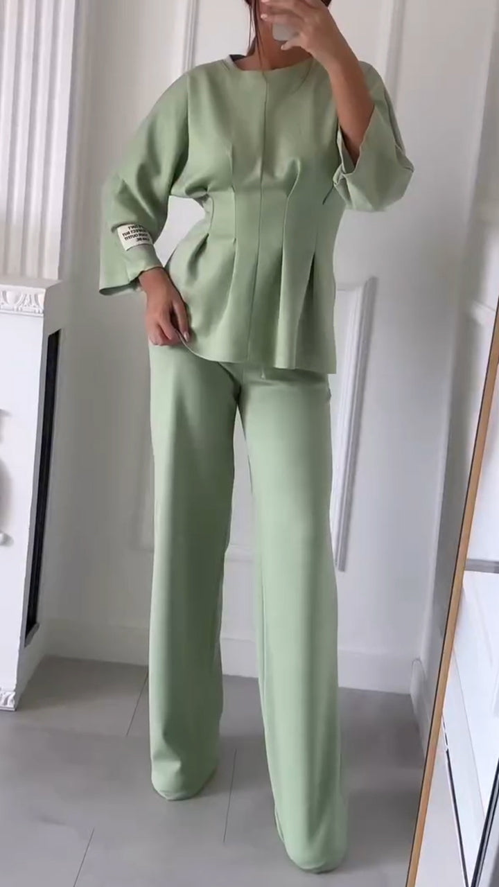 Women Round Neck Waist Cinched Top + Pants Casual Suit