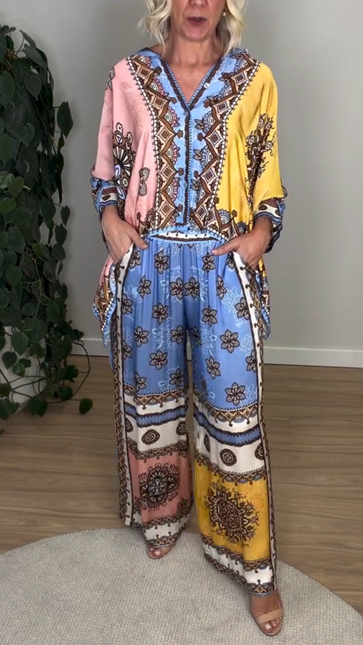 Women V-neck Printed Top and Pants Casual Suit