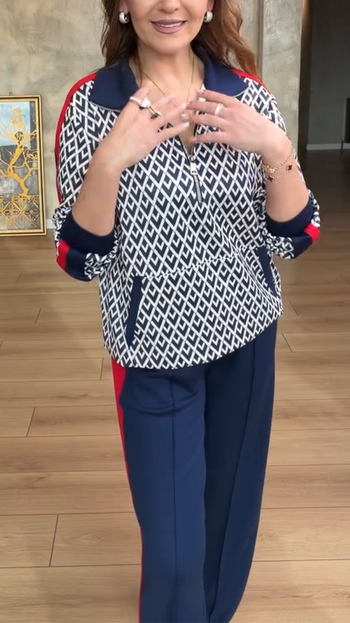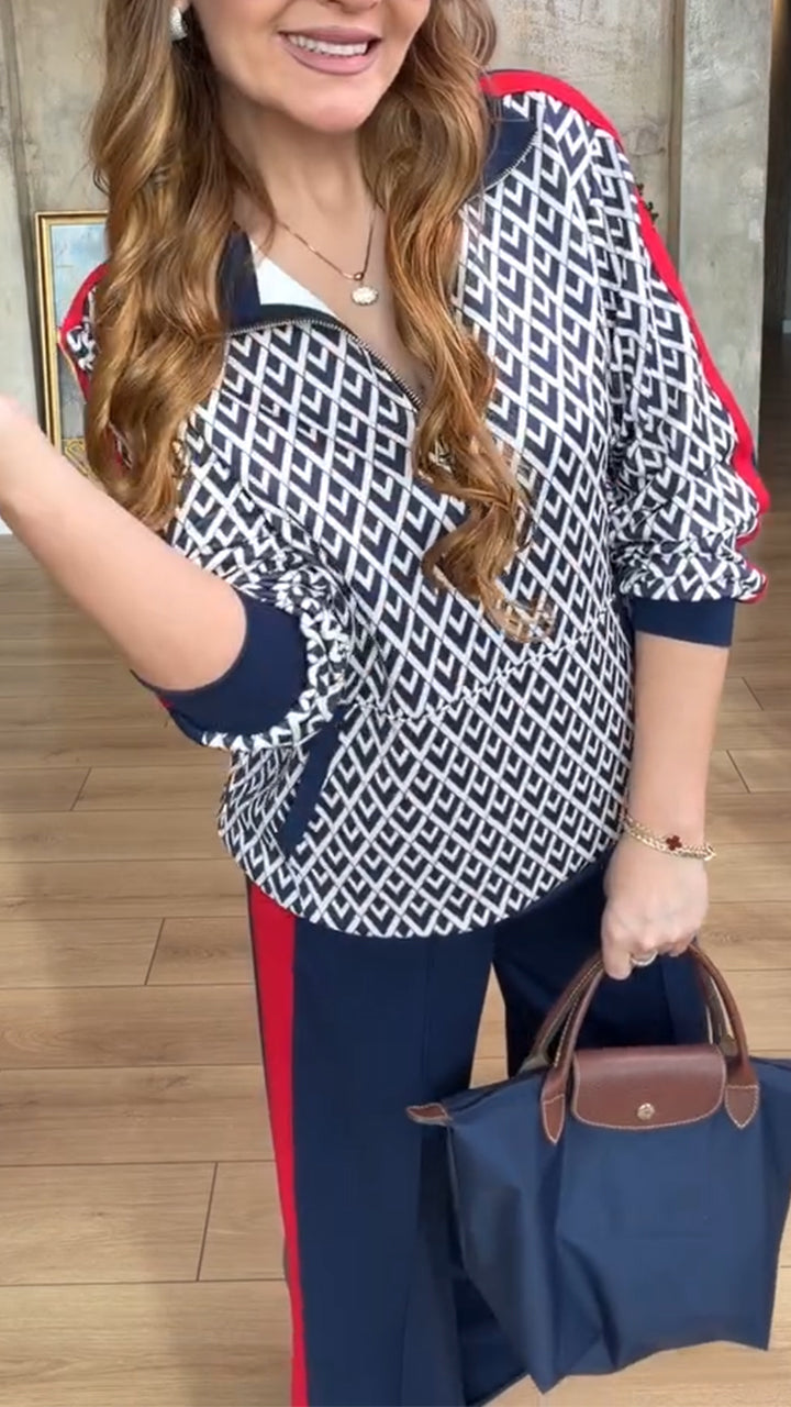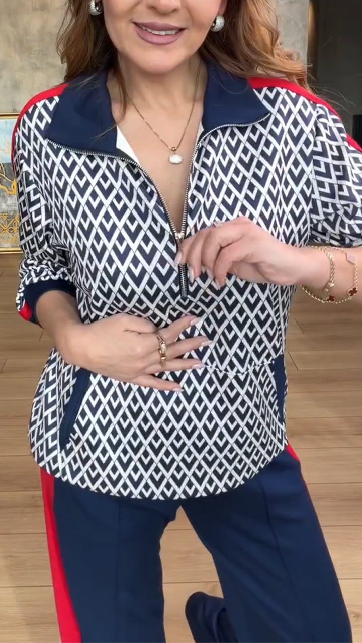 Womens Collar Half Zipper Printed Top + Pants Casual Set
