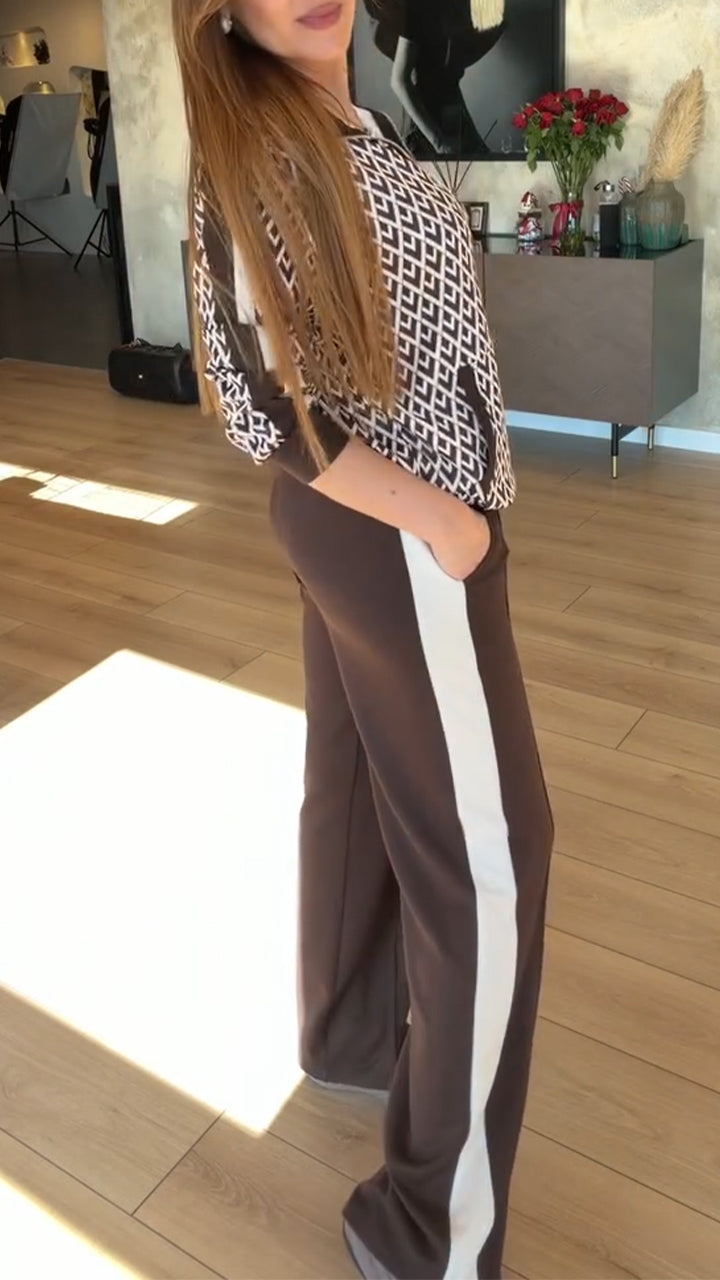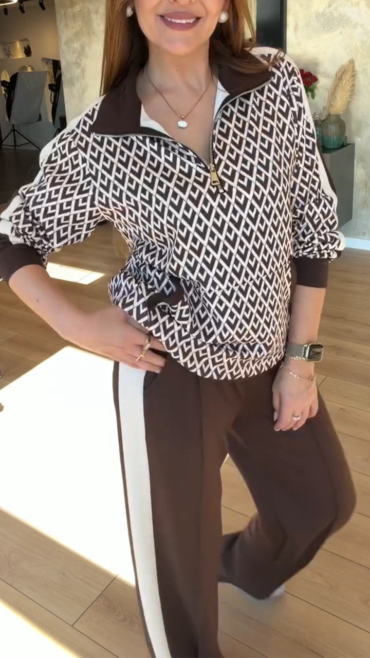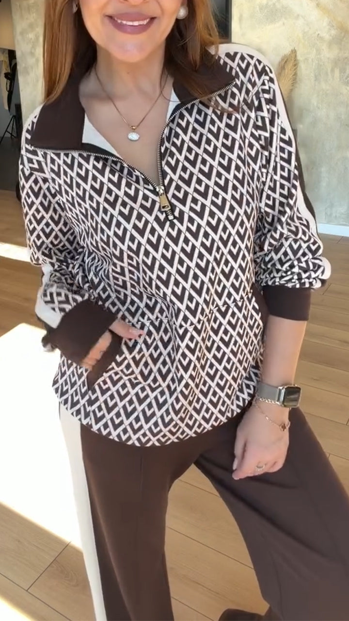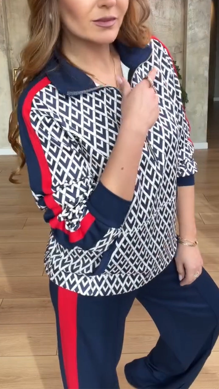 Womens Collar Half Zipper Printed Top + Pants Casual Set