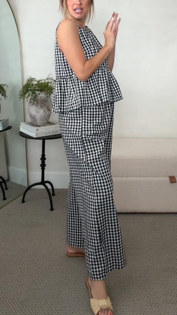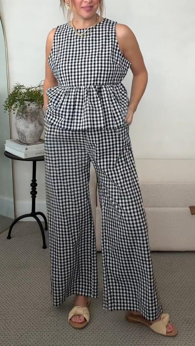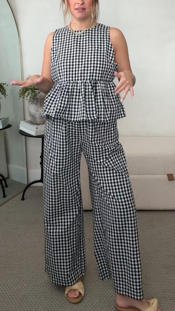 Womens Round Neck Plaid Top + Pants Casual Suit