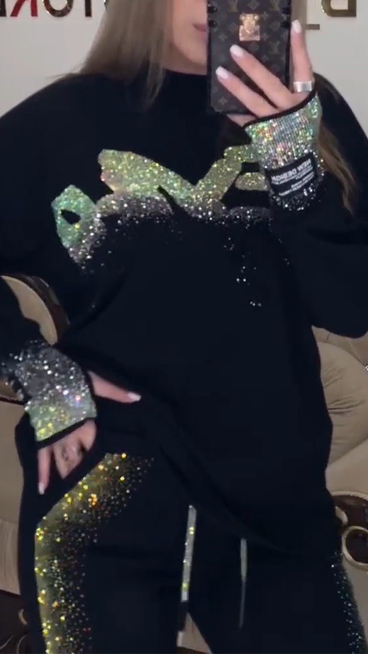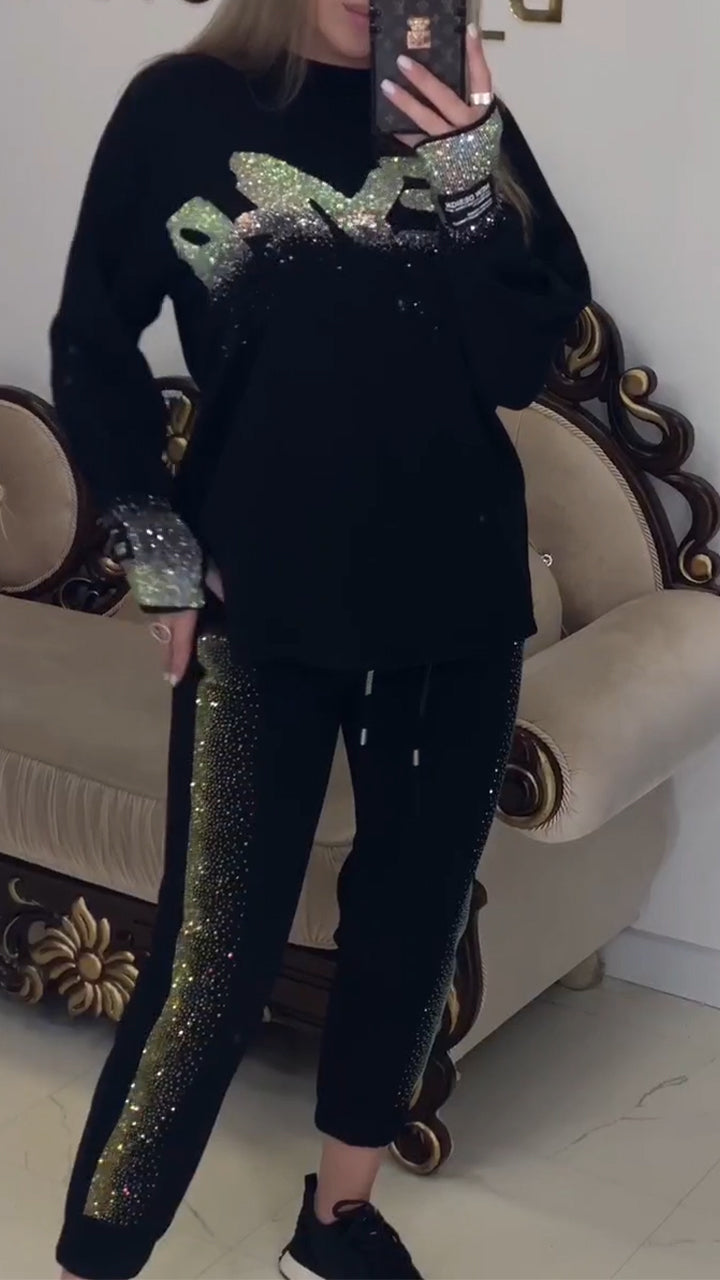 Womens Round Neck Rhinestone Casual Suit