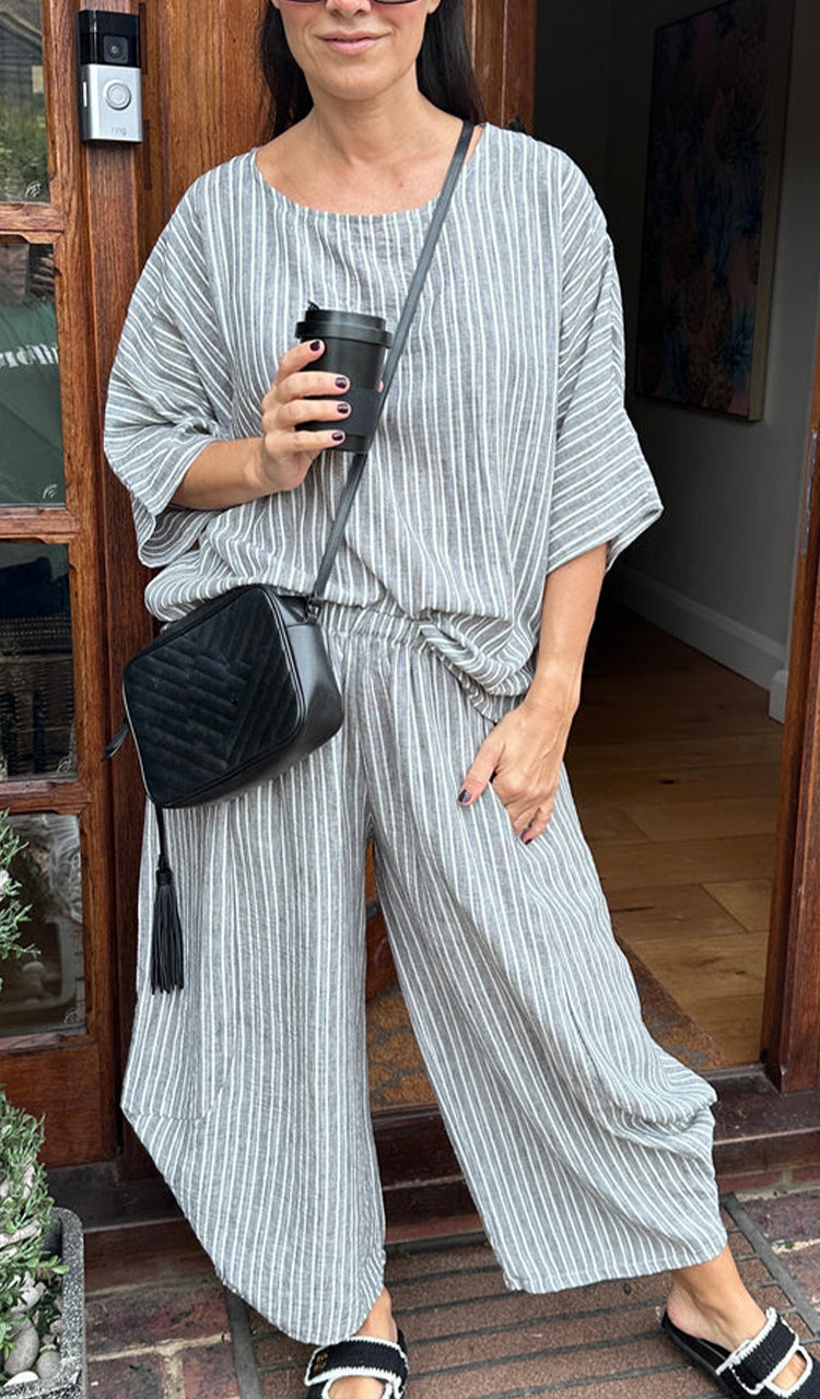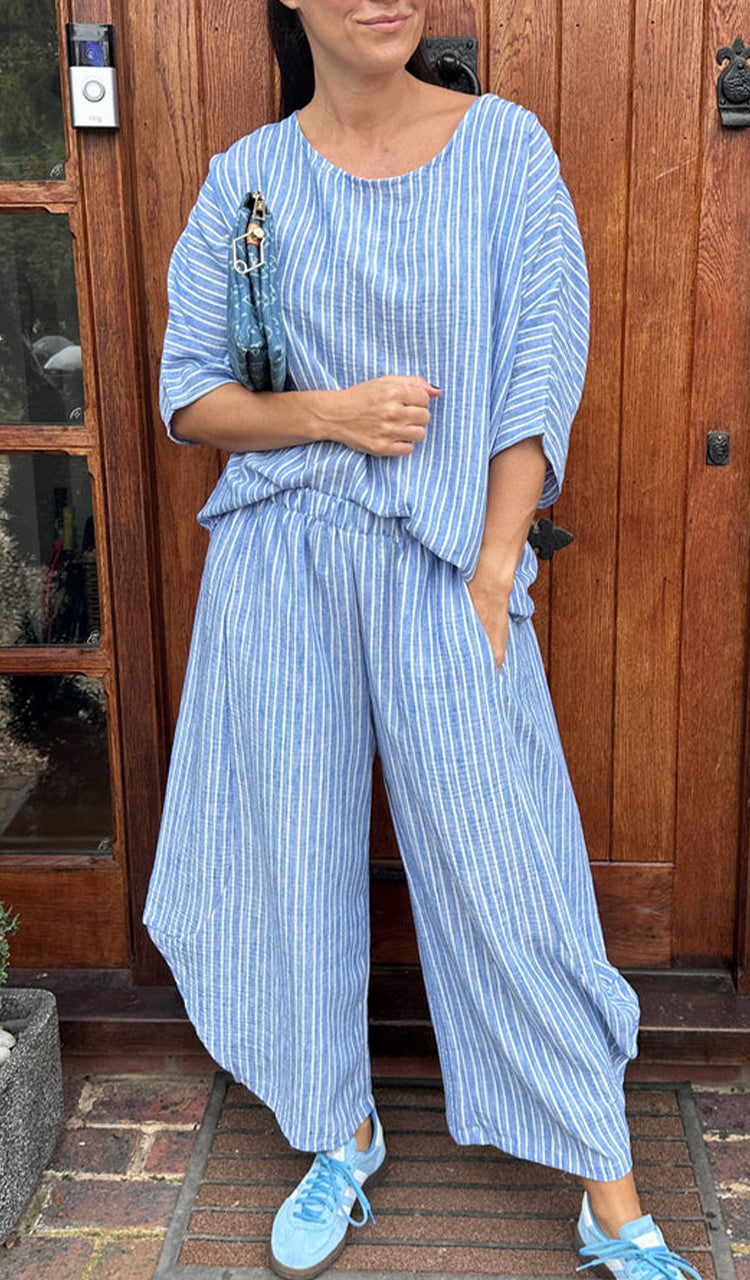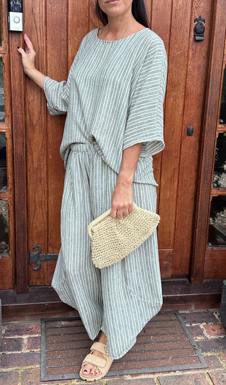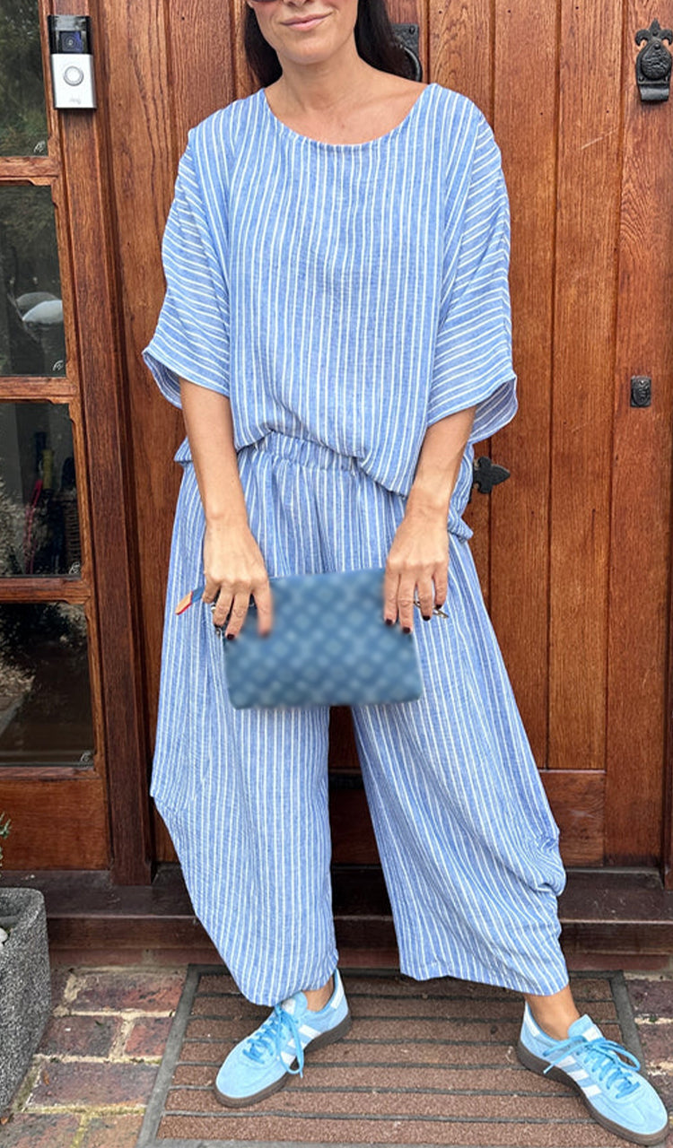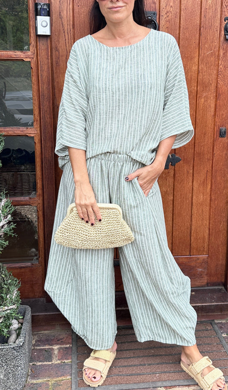 Womens Round Neck Vertical Patterned Cotton and Linen Casual Suit