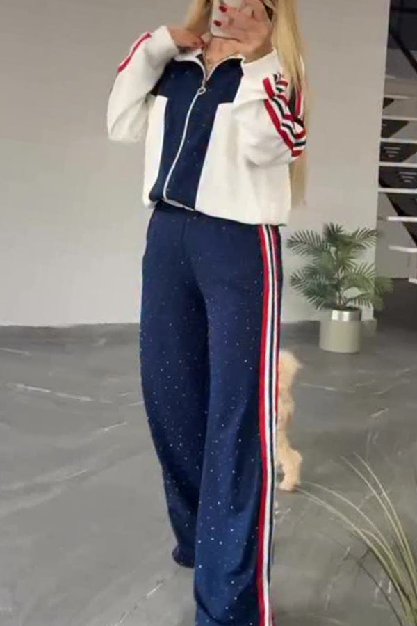 Women Casual Contrast Striped Shiny Textured Jacket + Pants Suit