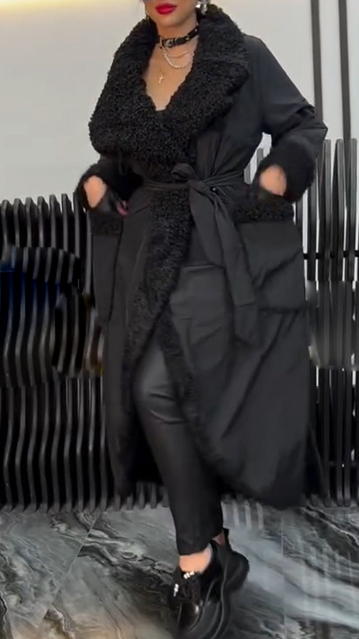 Women Lapel Stitching Plush Casual Long Cotton Jacket