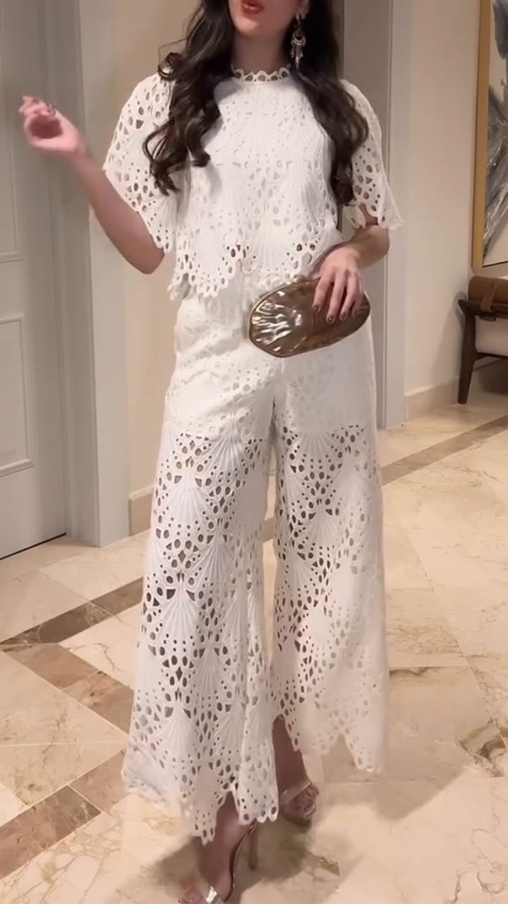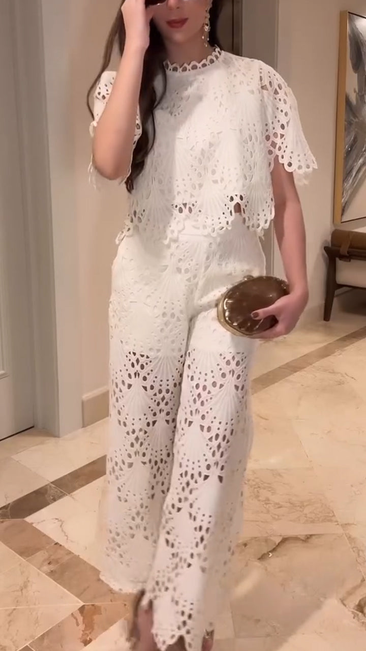 Women Round Neck Hollow Solid Color Casual Suit