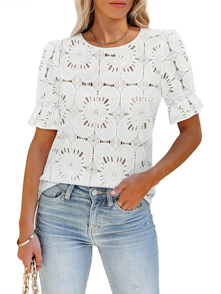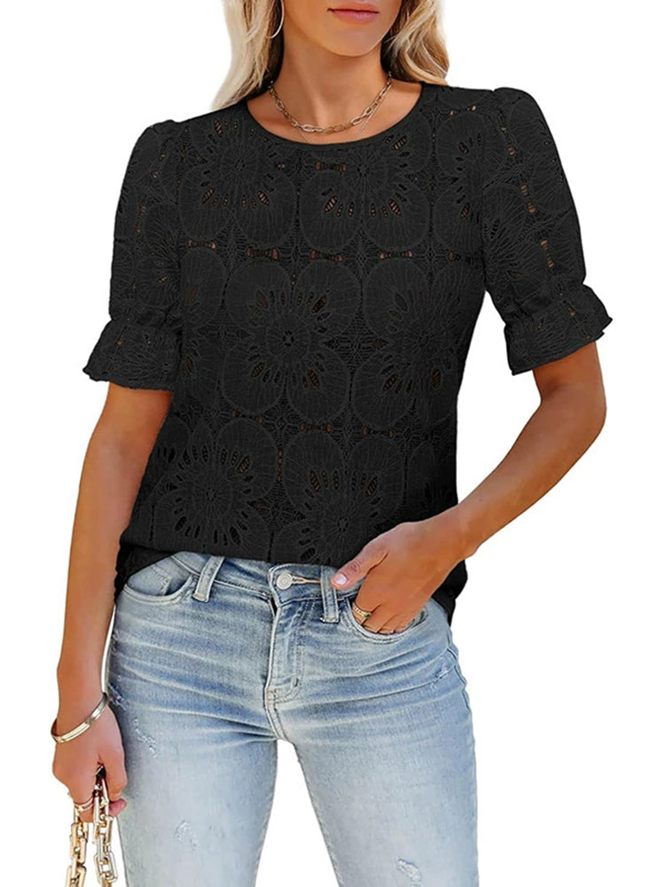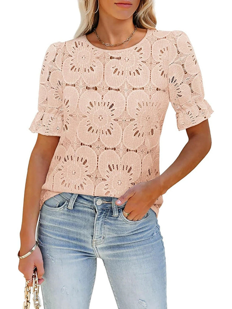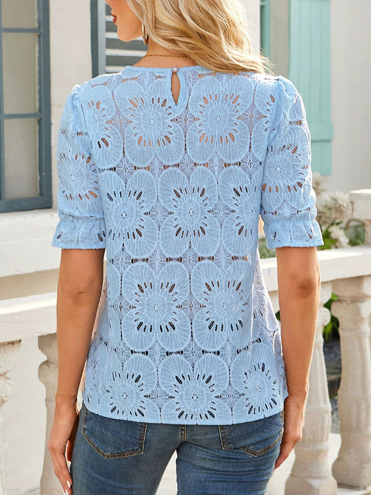 Women Round Neck Hollowed Laced Casual Tops