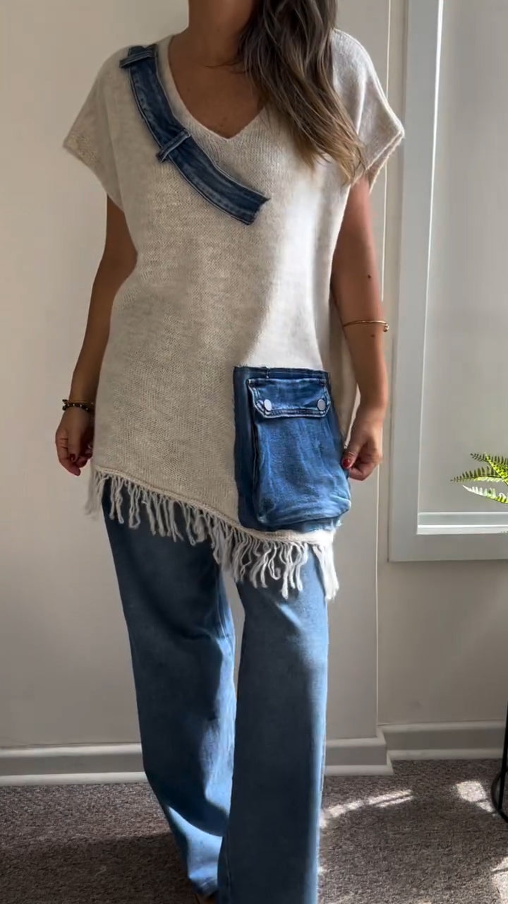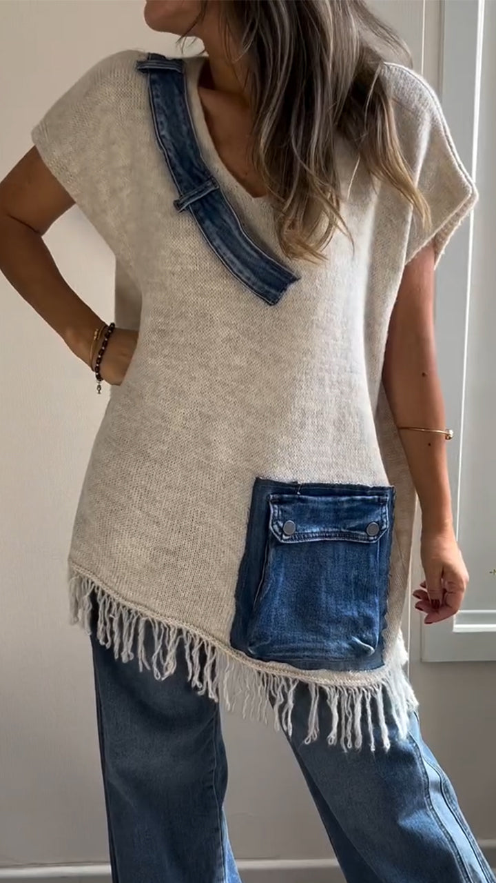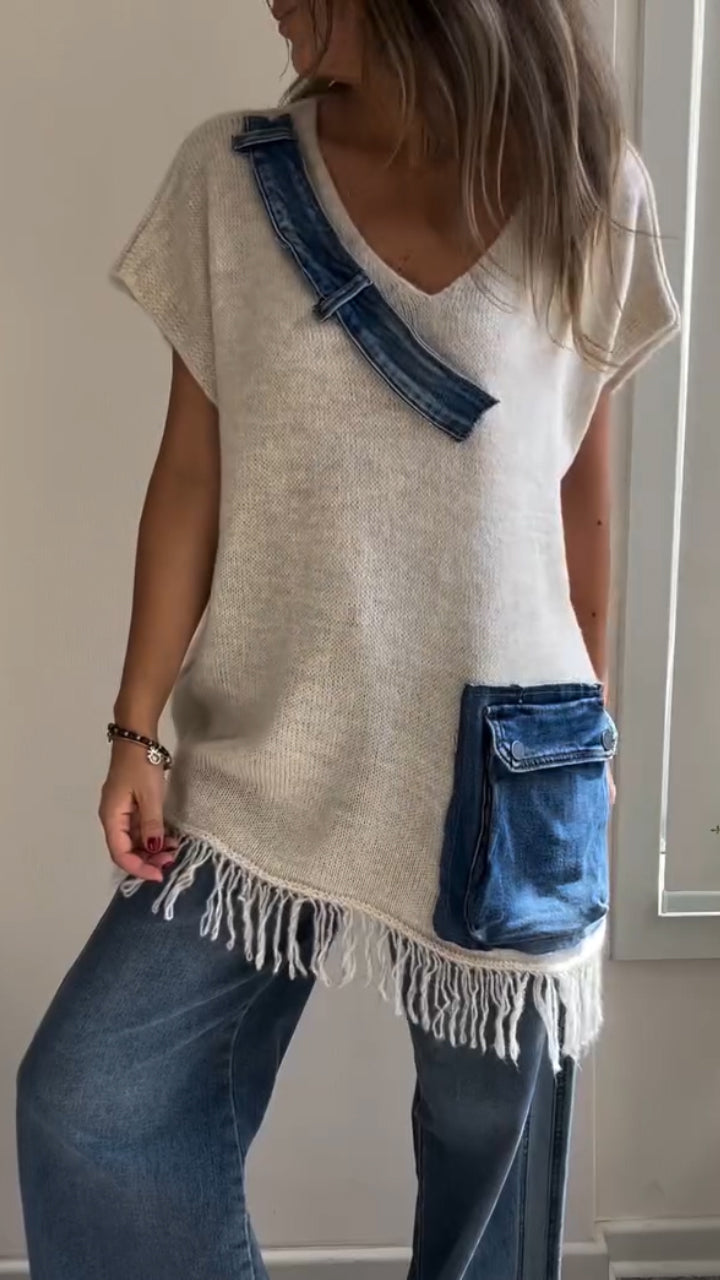 Women V-neck Patchwork Denim Tassel Casual Top