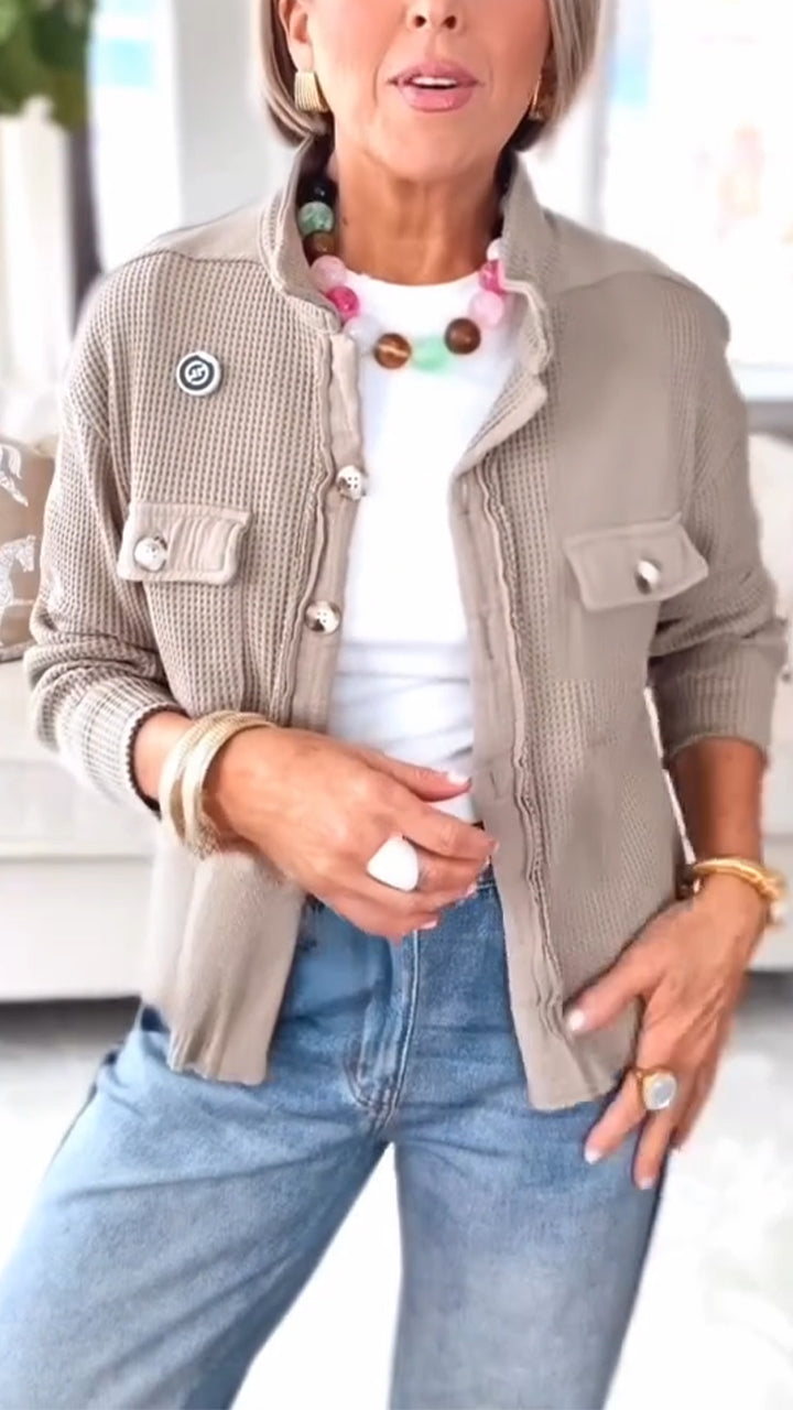 Women's Lapel Button Knitted Sleeve Casual Coat with Two Side Pockets