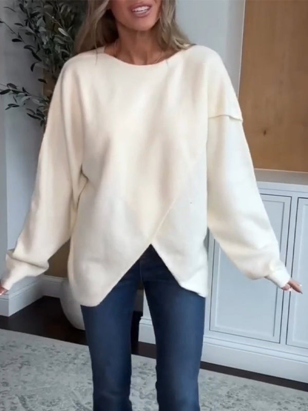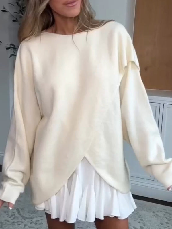 Women Round Neck Irregular Solid Color Top