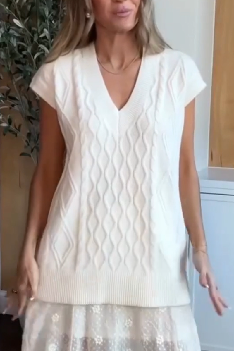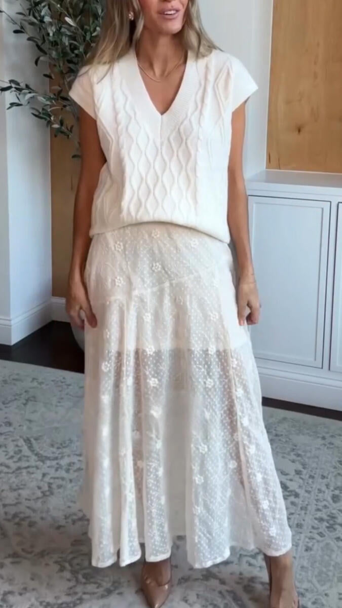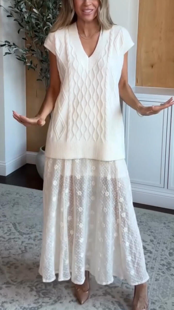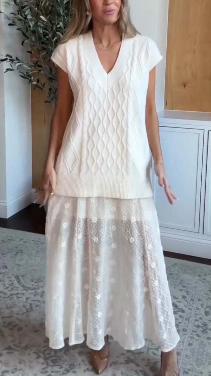 Women V-neck Knitted Top+ Printed Half Skirt Elegant Casual Set