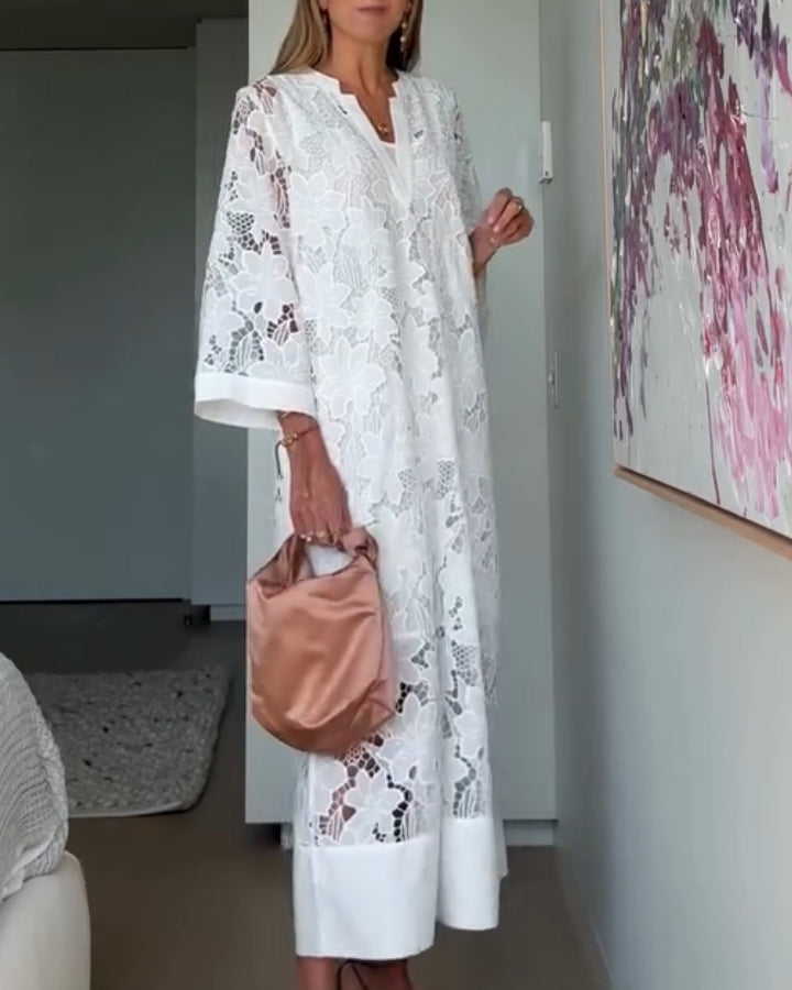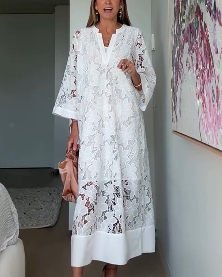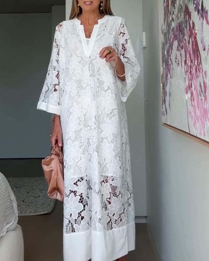 Womens Round Neck Lace Floral Pattern Hollow Out Elegant Casual Dress