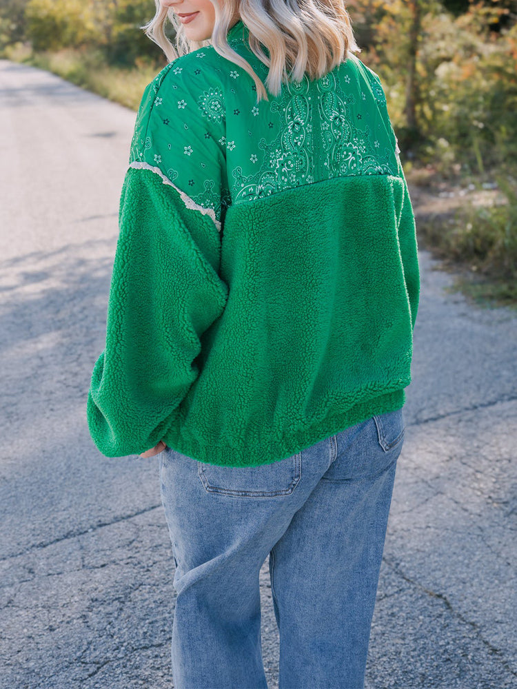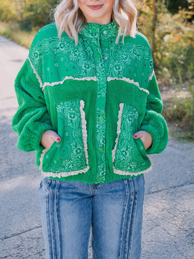 Women Round Neck Printed Patchwork Plush Casual Coat