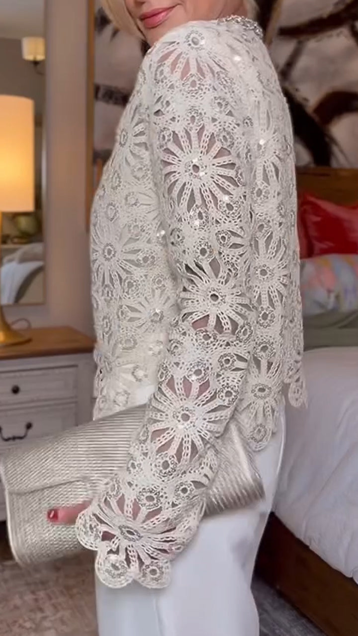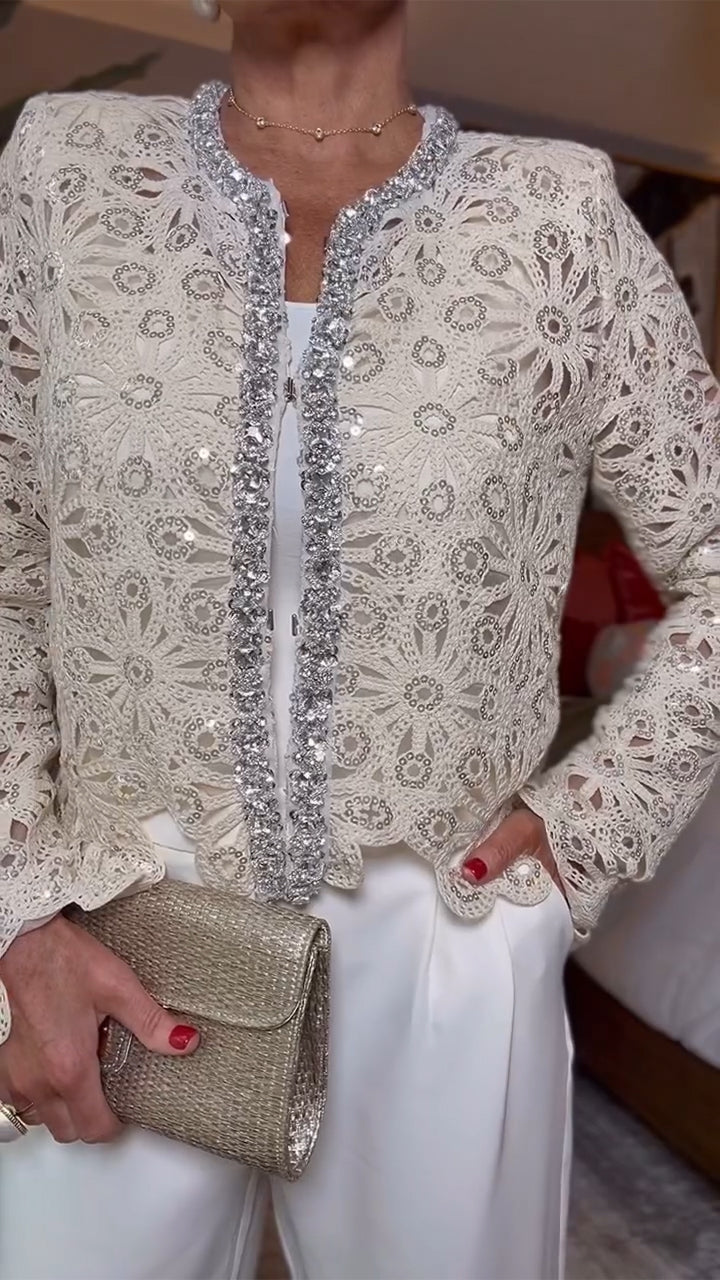 Women Round Neck Rhinestone Printed Hollowed Out Casual Cardigan