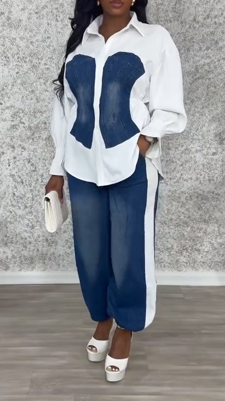 Women Laple Collar Splicing Denim Washing Water Casual Set