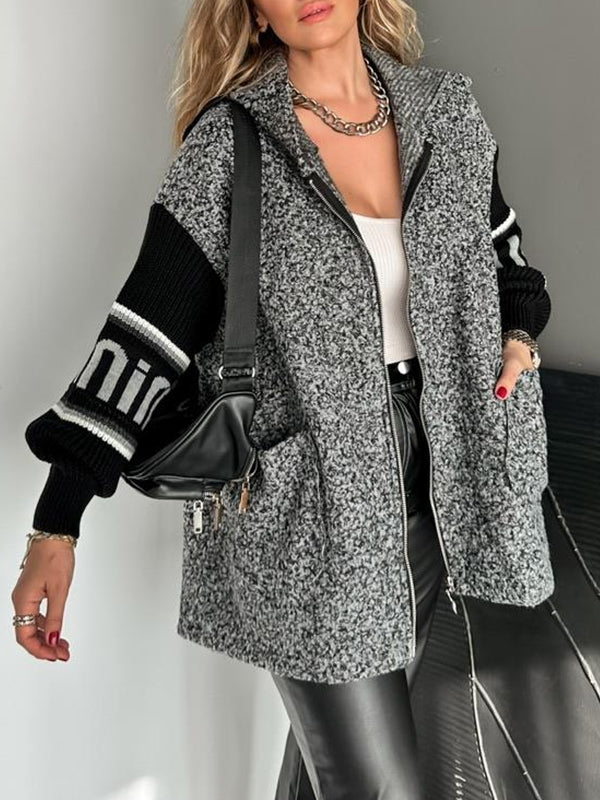Women Hooded Plush Spliced Knit Sleeve Casual Jacket