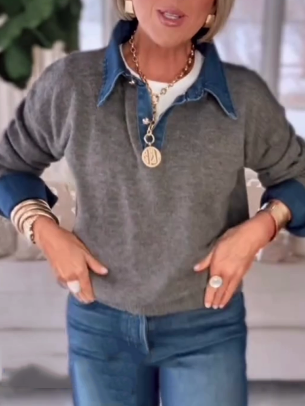 Women Laple Collar Denim Patchwork Sweater Casual Top