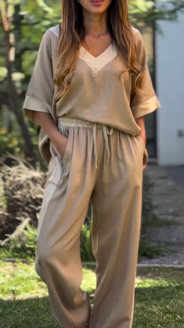 Women V-neck Top+ Drawstring Pants Loose Casual Suit